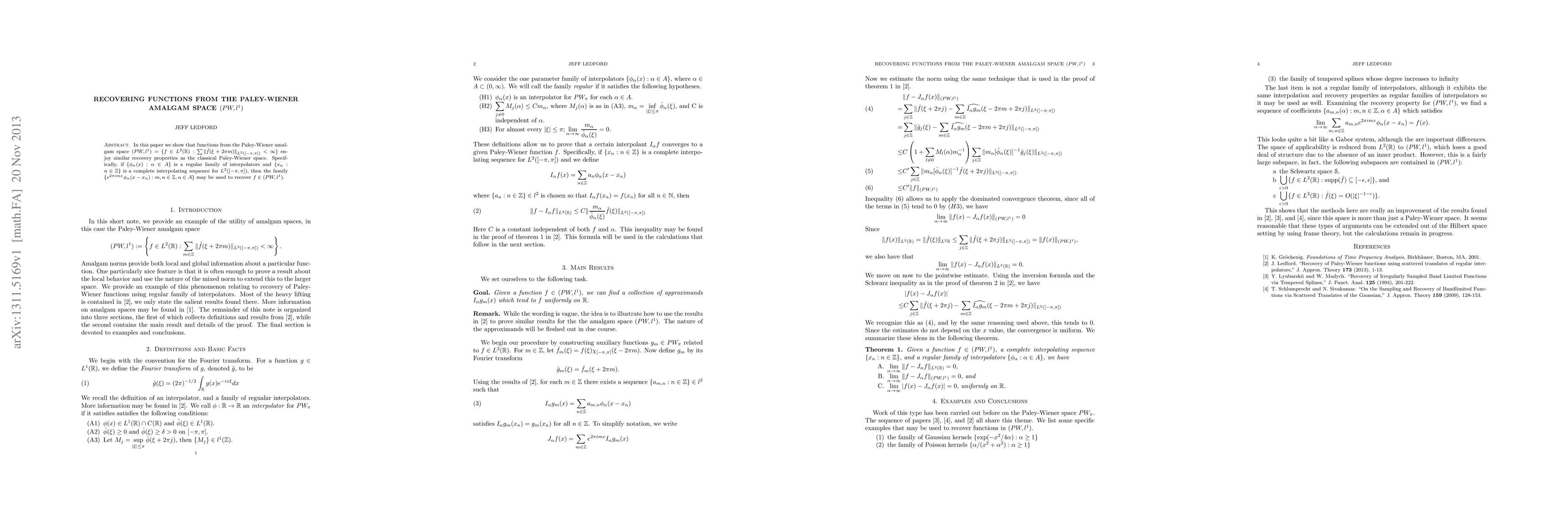 In this paper we show that functions from the Paley-Wiener amalgam space $(PW,l^1)=\{f\in L^2(\mathbb{R}): \sum\|\hat{f}(\xi+2\pi m) \|_{L^2([-\pi,\pi])} < \infty\}$ enjoy similar recovery properties as the classical Paley-Wiener space. Specifically, if $\{\phi_\alpha(x): \alpha\in A\}$ is a regular family of interpolators and $\{x_n: n\in \mathbb{Z}\}$ is a complete interpolating sequence for $L^2([-\pi,\pi])$, then the family $\{ e^{2\pi i m x}\phi_{\alpha}(x-x_n): m,n\in \mathbb{Z}, \alpha\in A \} $ may be used to recover $f\in(PW,l^1)$.