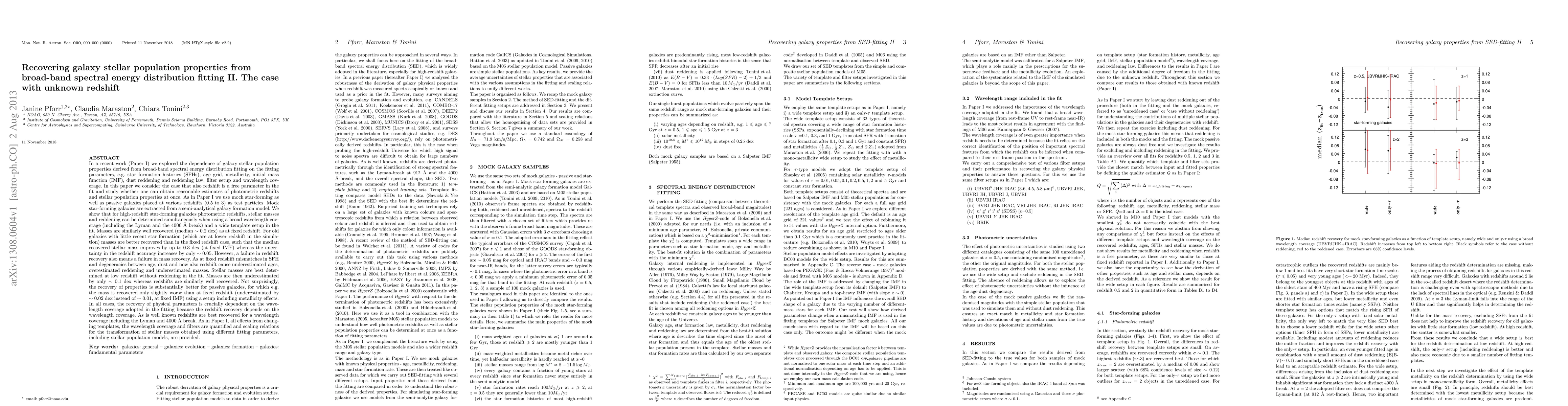 This paper investigates the recovery of galaxy stellar population properties and photometric redshifts using broad-band spectral energy distribution fitting when redshift is treated as a free parameter. It finds that high-z star-forming galaxies can yield accurate estimates of redshifts, stellar masses, and reddening with broad wavelength coverage, though passive galaxies show better recovery.