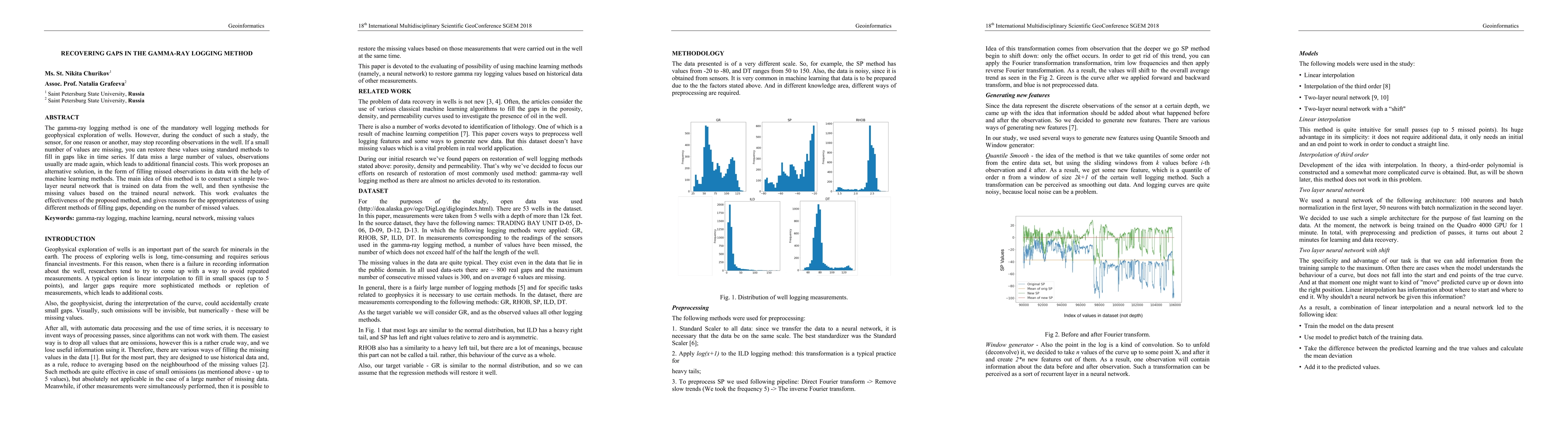 This paper proposes using a two-layer neural network to fill in missing data in the gamma-ray logging method, reducing the need for costly re-observations. The effectiveness of the machine learning approach is evaluated, and it is recommended based on the extent of data gaps.