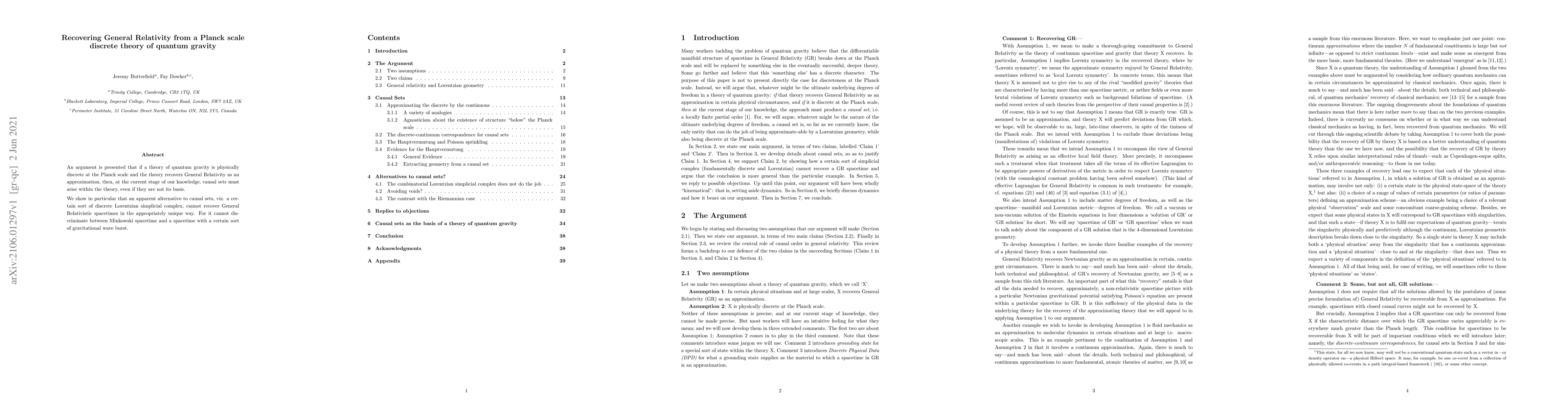 An argument is presented that if a theory of quantum gravity is physically discrete at the Planck scale and the theory recovers General Relativity as an approximation, then, at the current stage of our knowledge, causal sets must arise within the theory, even if they are not its basis. We show in particular that an apparent alternative to causal sets, viz. a certain sort of discrete Lorentzian simplicial complex, cannot recover General Relativistic spacetimes in the appropriately unique way. For it cannot discriminate between Minkowski spacetime and a spacetime with a certain sort of gravitational wave burst.