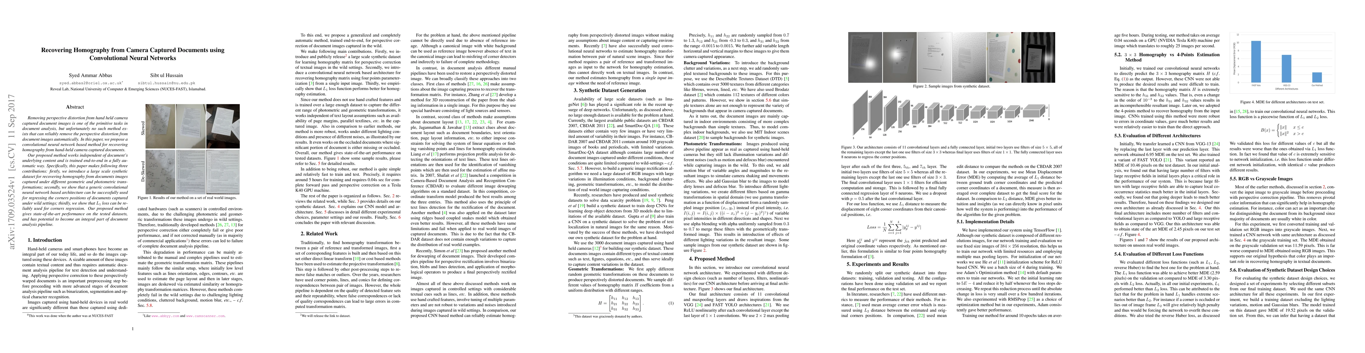 This paper proposes a convolutional neural network (CNN) method for automatically recovering homography to remove perspective distortion from hand-held camera captured document images. The method uses a large synthetic dataset, demonstrates state-of-the-art performance, and relies on L1 loss for corners regression, making it an effective tool for document analysis.