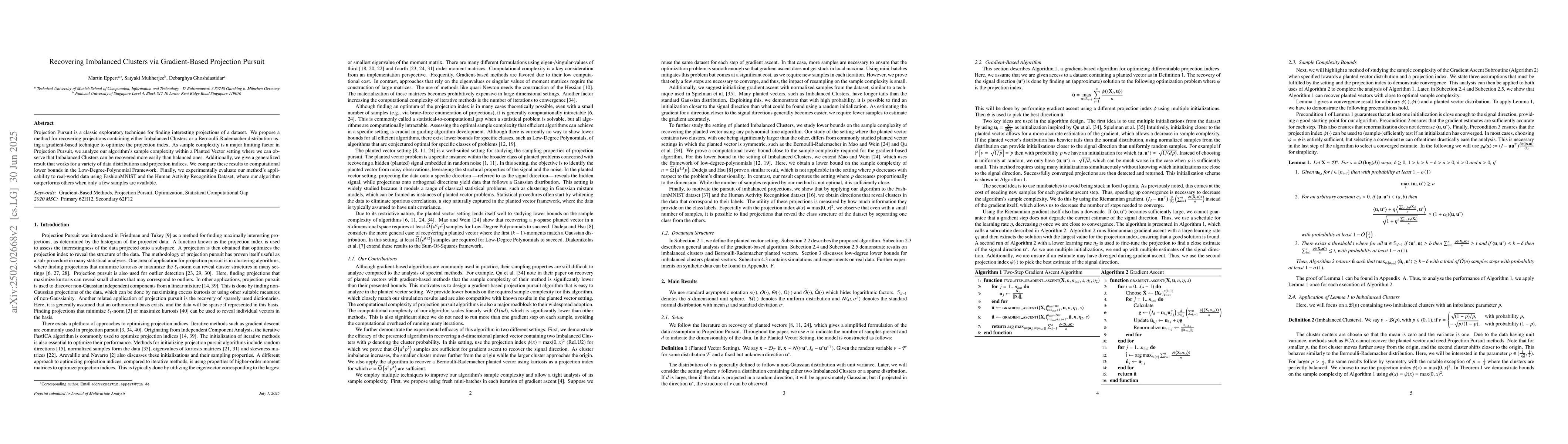 Projection Pursuit is a classic exploratory technique for finding interesting projections of a dataset. We propose a method for recovering projections containing either Imbalanced Clusters or a Bernoulli-Rademacher distribution using a gradient-based technique to optimize the projection index. As sample complexity is a major limiting factor in Projection Pursuit, we analyze our algorithm's sample complexity within a Planted Vector setting where we can observe that Imbalanced Clusters can be recovered more easily than balanced ones. Additionally, we give a generalized result that works for a variety of data distributions and projection indices. We compare these results to computational lower bounds in the Low-Degree-Polynomial Framework. Finally, we experimentally evaluate our method's applicability to real-world data using FashionMNIST and the Human Activity Recognition Dataset, where our algorithm outperforms others when only a few samples are available.