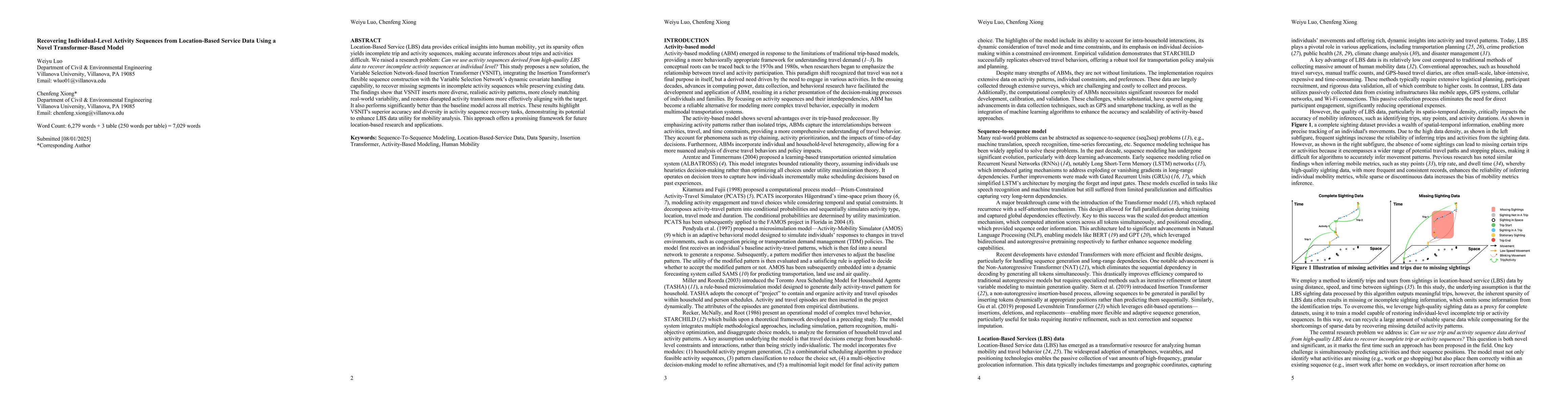 Location-Based Service (LBS) data provides critical insights into human mobility, yet its sparsity often yields incomplete trip and activity sequences, making accurate inferences about trips and activities difficult. We raise a research problem: Can we use activity sequences derived from high-quality LBS data to recover incomplete activity sequences at the individual level? This study proposes a new solution, the Variable Selection Network-fused Insertion Transformer (VSNIT), integrating the Insertion Transformer's flexible sequence construction with the Variable Selection Network's dynamic covariate handling capability, to recover missing segments in incomplete activity sequences while preserving existing data. The findings show that VSNIT inserts more diverse, realistic activity patterns, more closely matching real-world variability, and restores disrupted activity transitions more effectively aligning with the target. It also performs significantly better than the baseline model across all metrics. These results highlight VSNIT's superior accuracy and diversity in activity sequence recovery tasks, demonstrating its potential to enhance LBS data utility for mobility analysis. This approach offers a promising framework for future location-based research and applications.