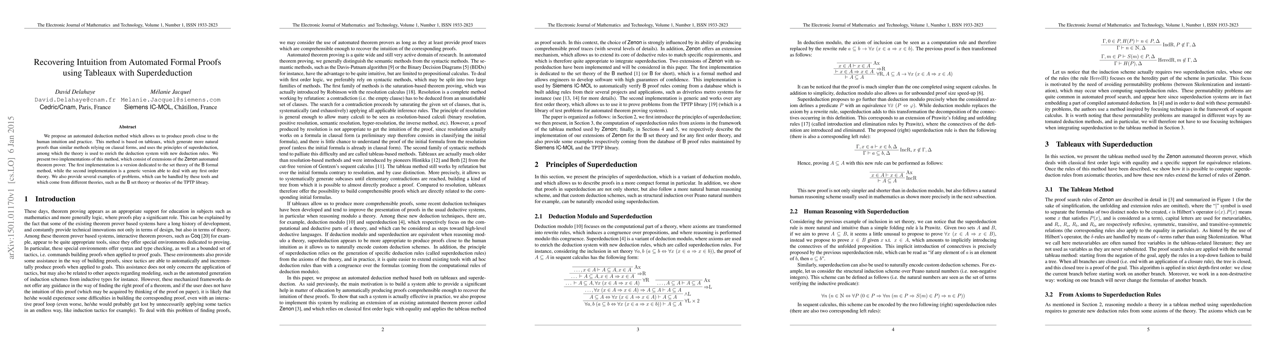 We propose an automated deduction method which allows us to produce proofs close to the human intuition and practice. This method is based on tableaux, which generate more natural proofs than similar methods relying on clausal forms, and uses the principles of superdeduction, among which the theory is used to enrich the deduction system with new deduction rules. We present two implementations of this method, which consist of extensions of the Zenon automated theorem prover. The first implementation is a version dedicated to the set theory of the B formal method, while the second implementation is a generic version able to deal with any first order theory. We also provide several examples of problems, which can be handled by these tools and which come from different theories, such as the B set theory or theories of the TPTP library.