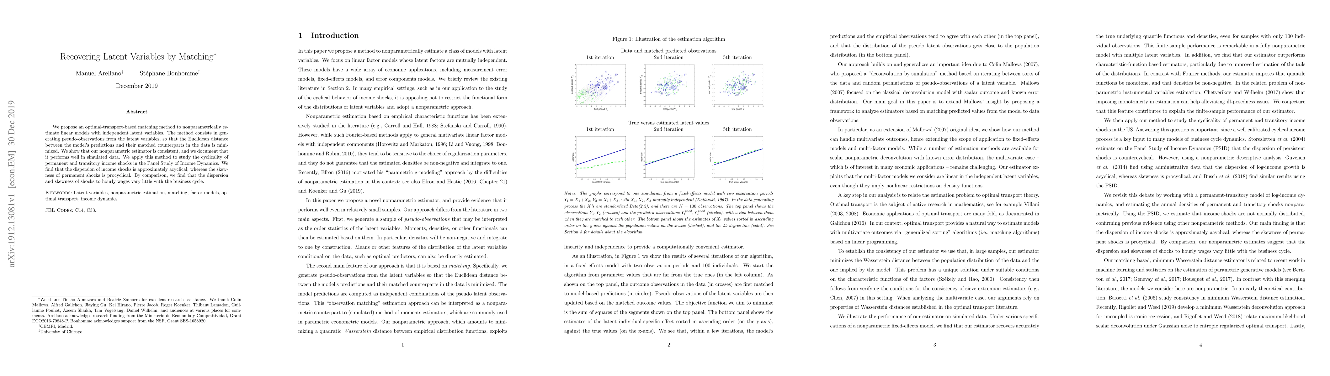 This paper introduces an optimal-transport-based matching method to estimate linear models with latent variables, demonstrating its consistency and effectiveness through simulations. The method reveals that income shock dispersion is acyclical, while permanent shock skewness is procyclical, contrasting with the relatively stable hourly wage shocks.