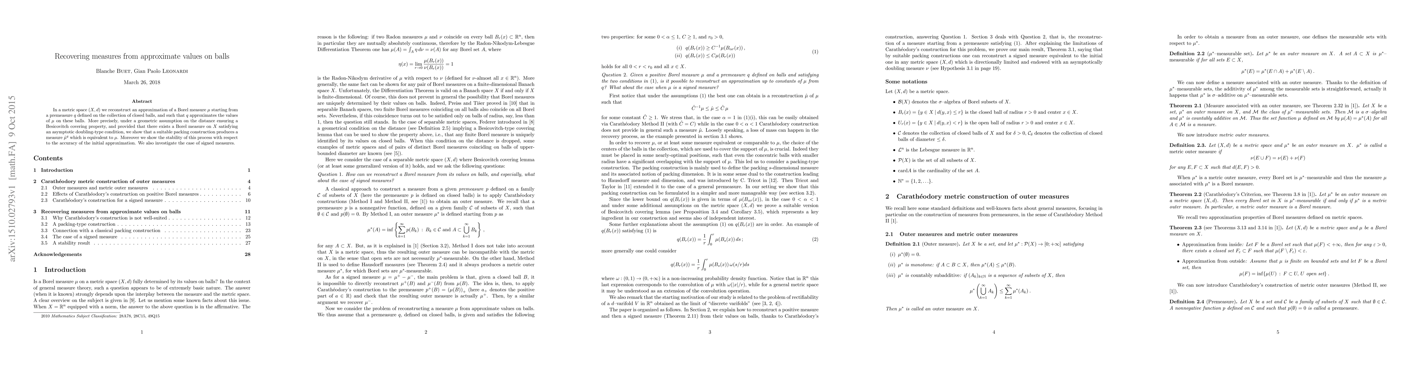 Researchers developed a method to recover an approximation of a Borel measure from approximate values on closed balls in a metric space, showing that it can produce a measure equivalent to the original and is stable with respect to initial approximation accuracy.