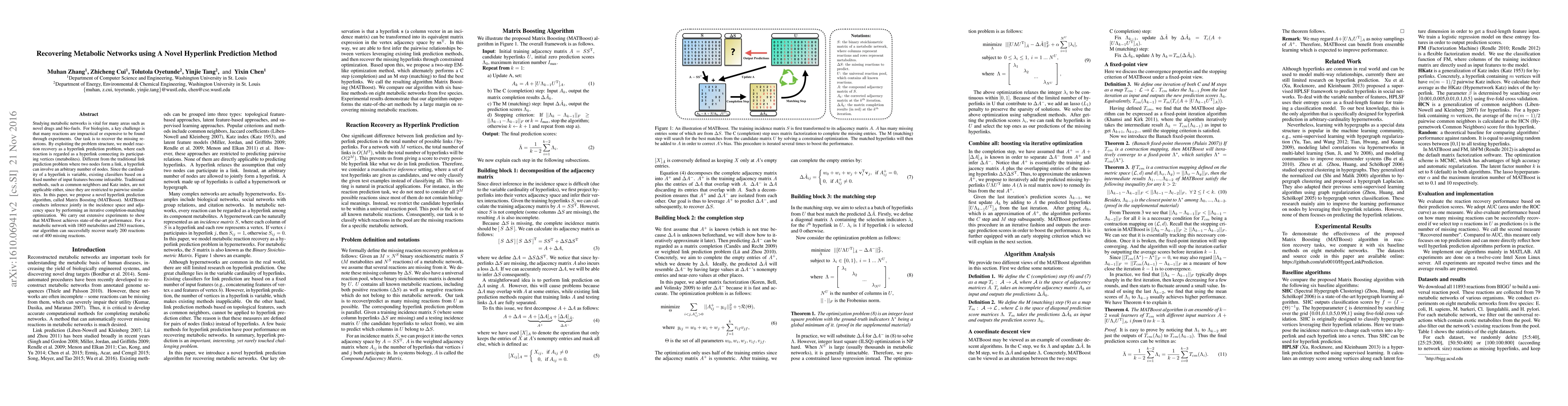 Studying metabolic networks is vital for many areas such as novel drugs and bio-fuels. For biologists, a key challenge is that many reactions are impractical or expensive to be found through experiments. Our task is to recover the missing reactions. By exploiting the problem structure, we model reaction recovery as a hyperlink prediction problem, where each reaction is regarded as a hyperlink connecting its participating vertices (metabolites). Different from the traditional link prediction problem where two nodes form a link, a hyperlink can involve an arbitrary number of nodes. Since the cardinality of a hyperlink is variable, existing classifiers based on a fixed number of input features become infeasible. Traditional methods, such as common neighbors and Katz index, are not applicable either, since they are restricted to pairwise similarities. In this paper, we propose a novel hyperlink prediction algorithm, called Matrix Boosting (MATBoost). MATBoost conducts inference jointly in the incidence space and adjacency space by performing an iterative completion-matching optimization. We carry out extensive experiments to show that MATBoost achieves state-of-the-art performance. For a metabolic network with 1805 metabolites and 2583 reactions, our algorithm can successfully recover nearly 200 reactions out of 400 missing reactions.