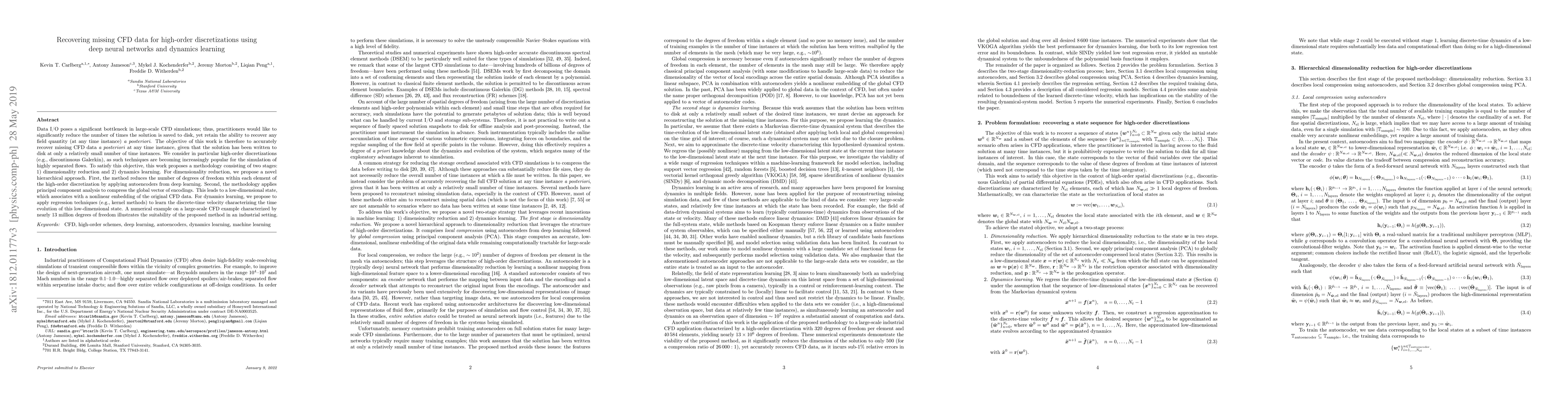 Data I/O poses a significant bottleneck in large-scale CFD simulations; thus, practitioners would like to significantly reduce the number of times the solution is saved to disk, yet retain the ability to recover any field quantity (at any time instance) a posteriori. The objective of this work is therefore to accurately recover missing CFD data a posteriori at any time instance, given that the solution has been written to disk at only a relatively small number of time instances. We consider in particular high-order discretizations (e.g., discontinuous Galerkin), as such techniques are becoming increasingly popular for the simulation of highly separated flows. To satisfy this objective, this work proposes a methodology consisting of two stages: 1) dimensionality reduction and 2) dynamics learning. For dimensionality reduction, we propose a novel hierarchical approach. First, the method reduces the number of degrees of freedom within each element of the high-order discretization by applying autoencoders from deep learning. Second, the methodology applies principal component analysis to compress the global vector of encodings. This leads to a low-dimensional state, which associates with a nonlinear embedding of the original CFD data. For dynamics learning, we propose to apply regression techniques (e.g., kernel methods) to learn the discrete-time velocity characterizing the time evolution of this low-dimensional state. A numerical example on a large-scale CFD example characterized by nearly 13 million degrees of freedom illustrates the suitability of the proposed method in an industrial setting.