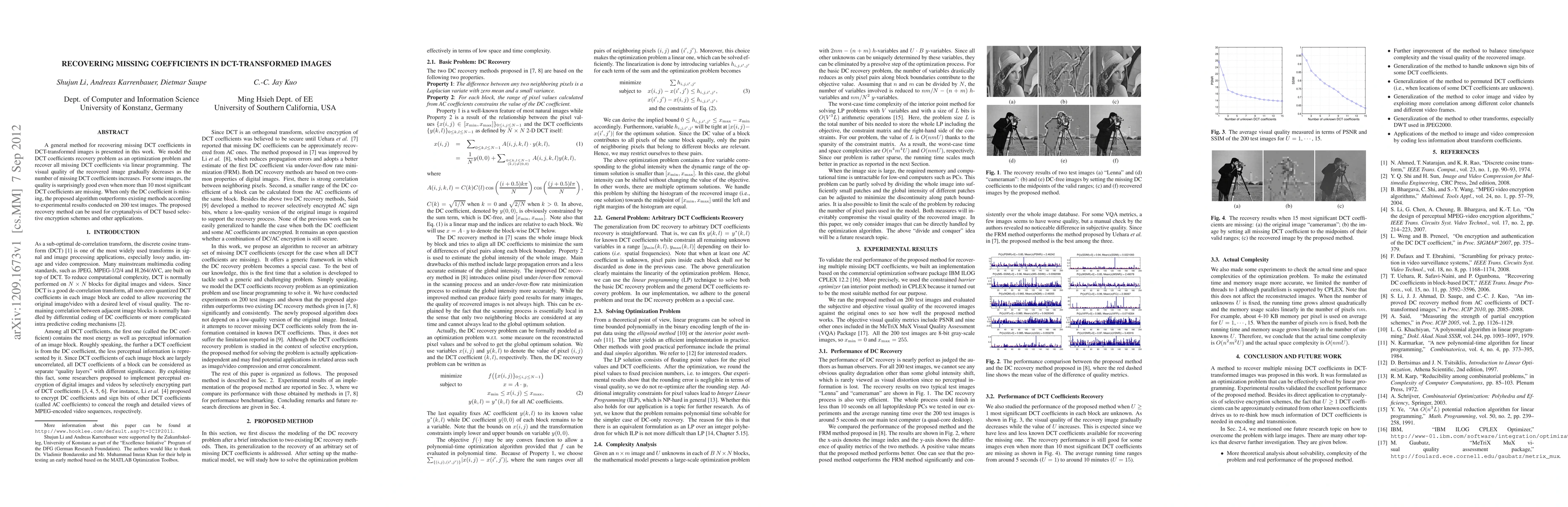 This paper presents a method for recovering missing DCT coefficients in transformed images using linear programming optimization, achieving surprisingly good visual quality even with significant coefficient loss. The algorithm outperforms existing methods when only the DC coefficient is missing, with potential applications in cryptanalysis and other fields.