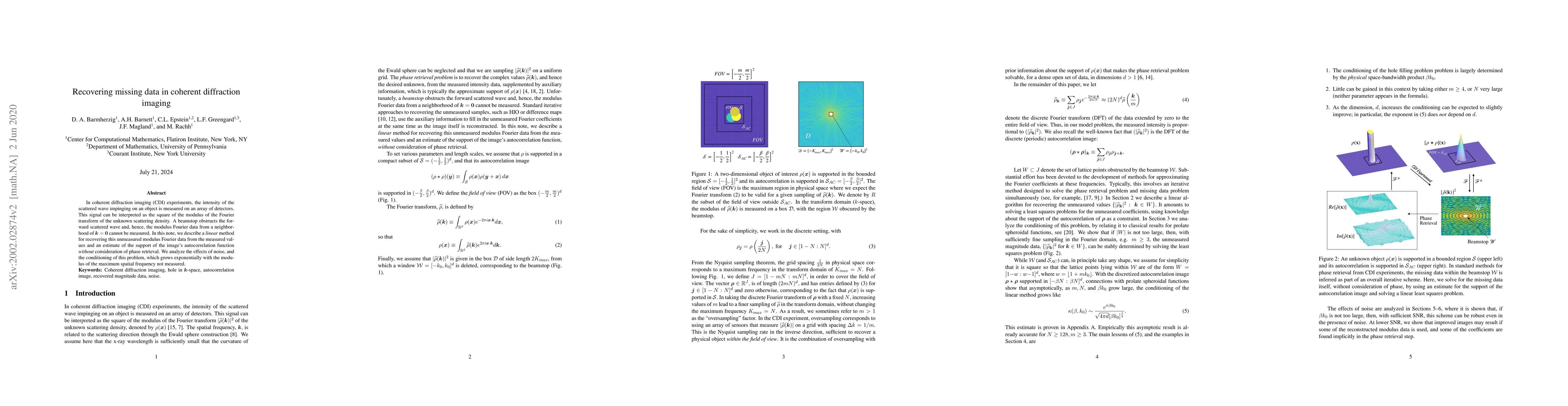 In coherent diffraction imaging (CDI) experiments, the intensity of the scattered wave impinging on an object is measured on an array of detectors. This signal can be interpreted as the square of the modulus of the Fourier transform of the unknown scattering density. A beam-stop obstructs the forward scattered wave and, hence, the modulus Fourier data from a neighborhood of k=0 cannot be measured. In this note, we describe a linear method for recovering this unmeasured modulus Fourier data from the measured values and an estimate of the support of the image's autocorrelation function without consideration of phase retrieval. We analyze the conditioning of this problem, which grows exponentially with the modulus of the maximum spatial frequency not measured, and the effects of noise.