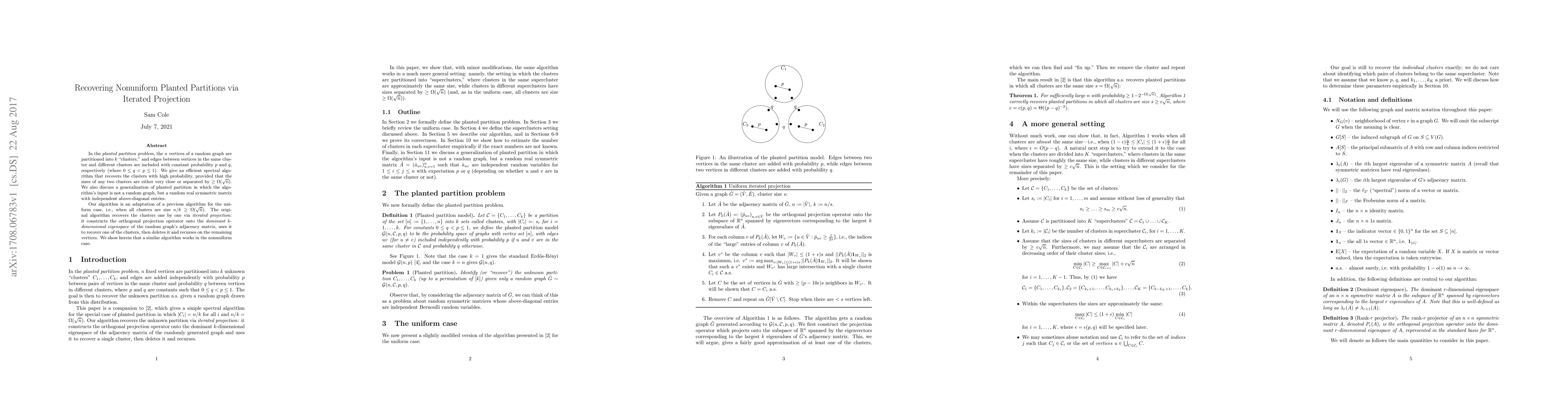 In the planted partition problem, the $n$ vertices of a random graph are partitioned into $k$ "clusters," and edges between vertices in the same cluster and different clusters are included with constant probability $p$ and $q$, respectively (where $0 \le q < p \le 1$). We give an efficient spectral algorithm that recovers the clusters with high probability, provided that the sizes of any two clusters are either very close or separated by $\geq \Omega(\sqrt n)$. We also discuss a generalization of planted partition in which the algorithm's input is not a random graph, but a random real symmetric matrix with independent above-diagonal entries. Our algorithm is an adaptation of a previous algorithm for the uniform case, i.e., when all clusters are size $n / k \geq \Omega(\sqrt n)$. The original algorithm recovers the clusters one by one via iterated projection: it constructs the orthogonal projection operator onto the dominant $k$-dimensional eigenspace of the random graph's adjacency matrix, uses it to recover one of the clusters, then deletes it and recurses on the remaining vertices. We show herein that a similar algorithm works in the nonuniform case.
