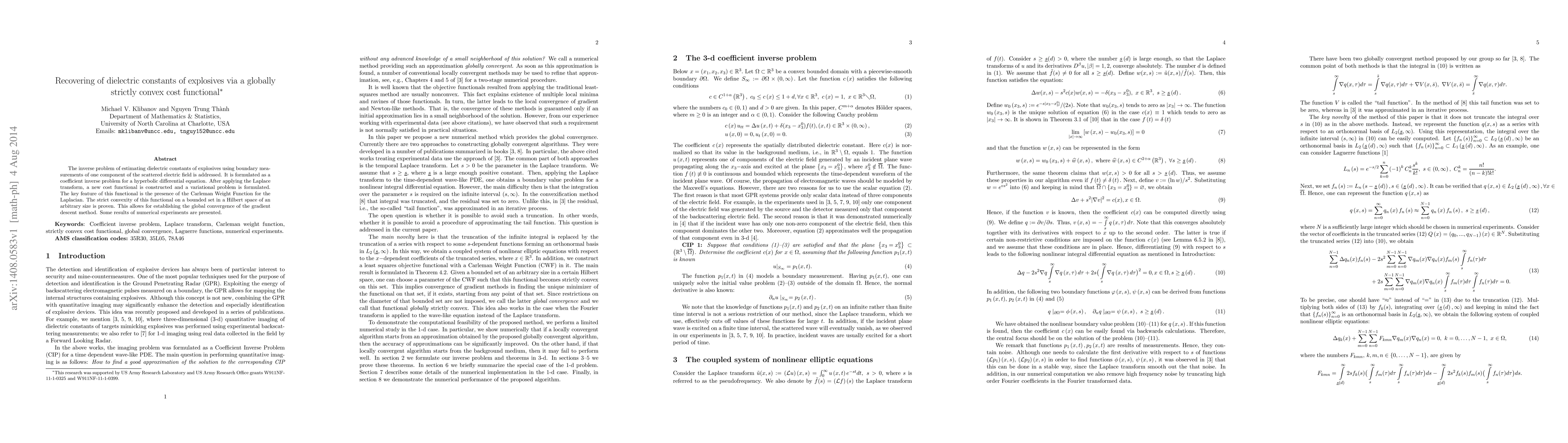The inverse problem of estimating dielectric constants of explosives using boundary measurements of one component of the scattered electric field is addressed. It is formulated as a coefficient inverse problem for a hyperbolic differential equation. After applying the Laplace transform, a new cost functional is constructed and a variational problem is formulated. The key feature of this functional is the presence of the Carleman Weight Function for the Laplacian. The strict convexity of this functional on a bounded set in a Hilbert space of an arbitrary size is proven. This allows for establishing the global convergence of the gradient descent method. Some results of numerical experiments are presented.