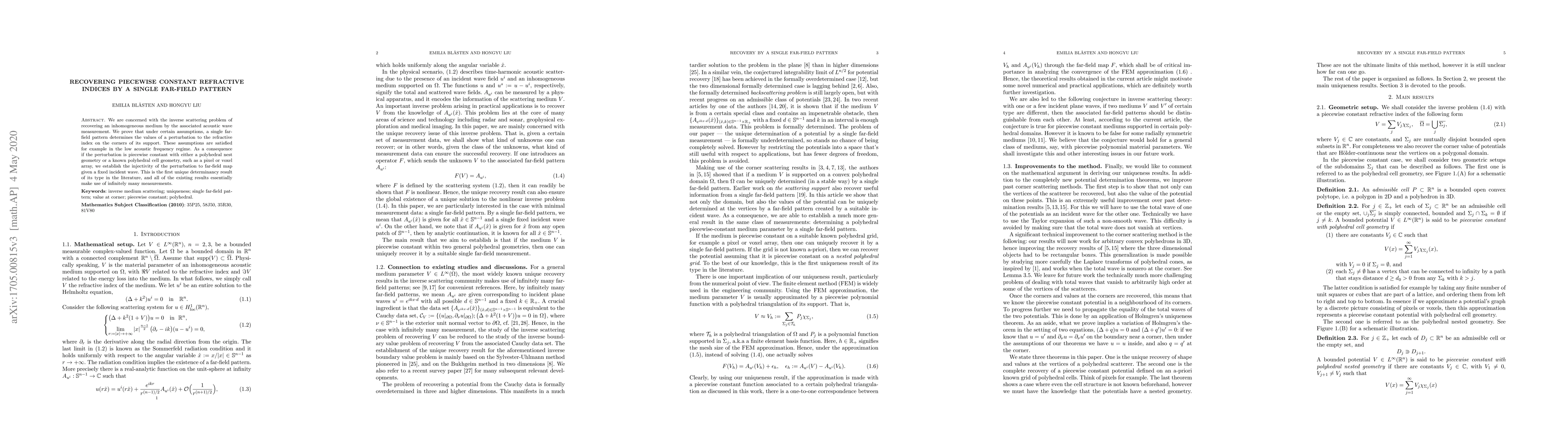This paper addresses the inverse scattering problem to recover piecewise constant refractive indices from a single far-field pattern, proving that under certain assumptions, a single far-field measurement can uniquely determine the refractive index perturbations at the corners of its support. This result is novel and applies to low acoustic frequency regimes, particularly for polyhedral nest or known polyhedral cell geometries.