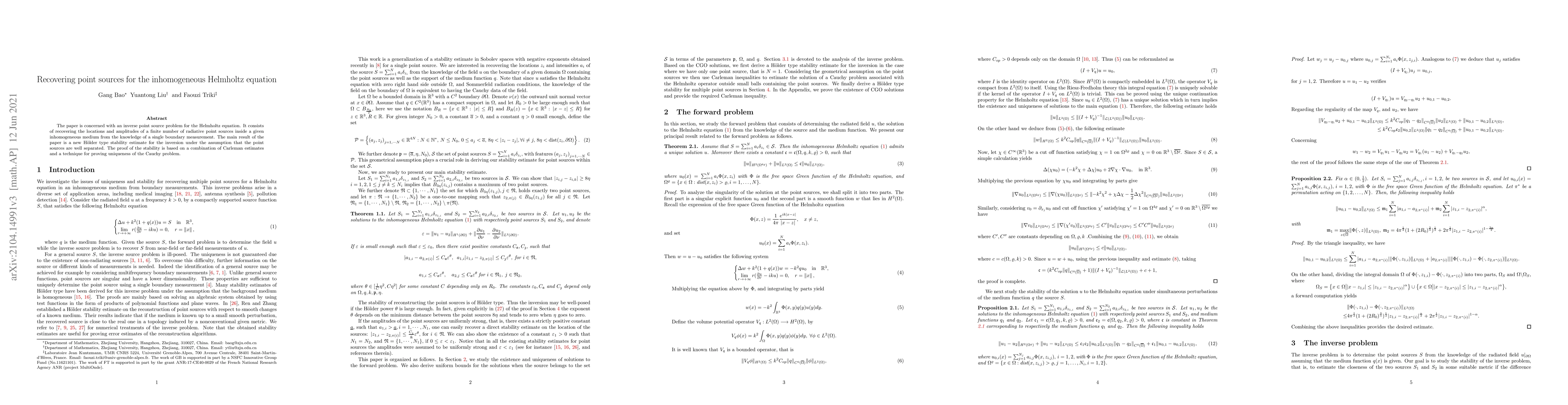 The paper is concerned with an inverse point source problem for the Helmholtz equation. It consists of recovering the locations and amplitudes of a finite number of radiative point sources inside a given inhomogeneous medium from the knowledge of a single boundary measurement. The main result of the paper is a new H\"{o}lder type stability estimate for the inversion under the assumption that the point sources are well separated. The proof of the stability is based on a combination of Carleman estimates and a technique for proving uniqueness of the Cauchy problem.