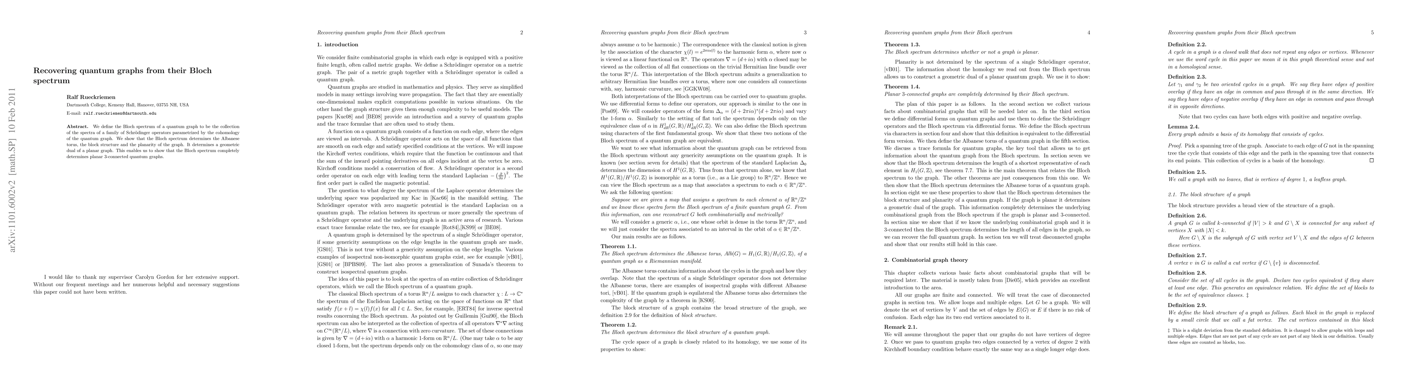 We define the Bloch spectrum of a quantum graph to be the collection of the spectra of a family of Schrodinger operators parametrized by the cohomology of the quantum graph. We show that the Bloch spectrum determines the Albanese torus, the block structure and the planarity of the graph. It determines a geometric dual of a planar graph. This enables us to show that the Bloch spectrum completely determines planar 3-connected quantum graphs.