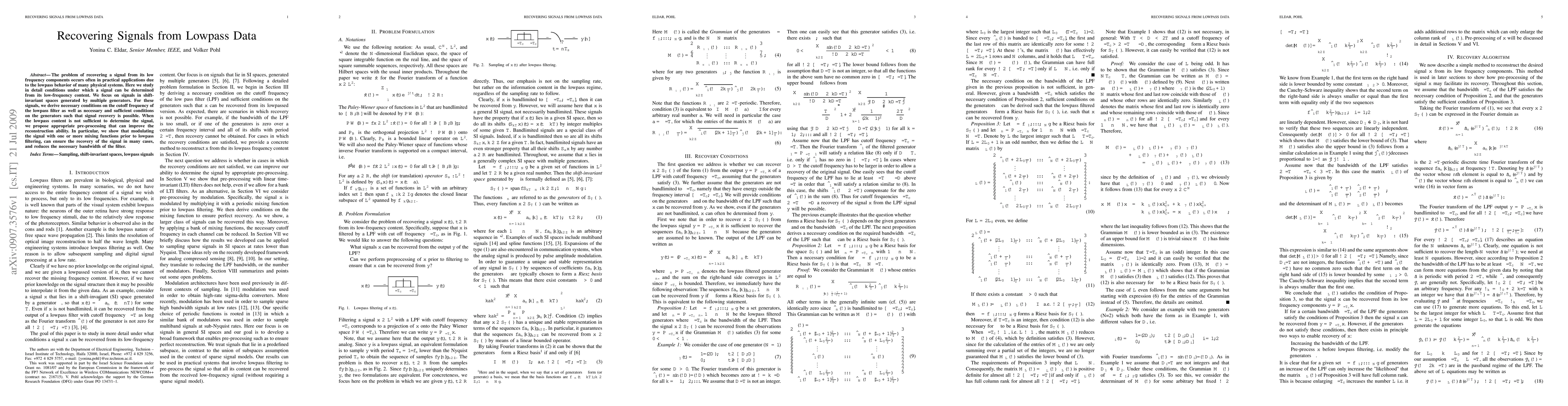 The problem of recovering a signal from its low frequency components occurs often in practical applications due to the lowpass behavior of many physical systems. Here we study in detail conditions under which a signal can be determined from its low-frequency content. We focus on signals in shift-invariant spaces generated by multiple generators. For these signals, we derive necessary conditions on the cutoff frequency of the lowpass filter as well as necessary and sufficient conditions on the generators such that signal recovery is possible. When the lowpass content is not sufficient to determine the signal, we propose appropriate pre-processing that can improve the reconstruction ability. In particular, we show that modulating the signal with one or more mixing functions prior to lowpass filtering, can ensure the recovery of the signal in many cases, and reduces the necessary bandwidth of the filter.