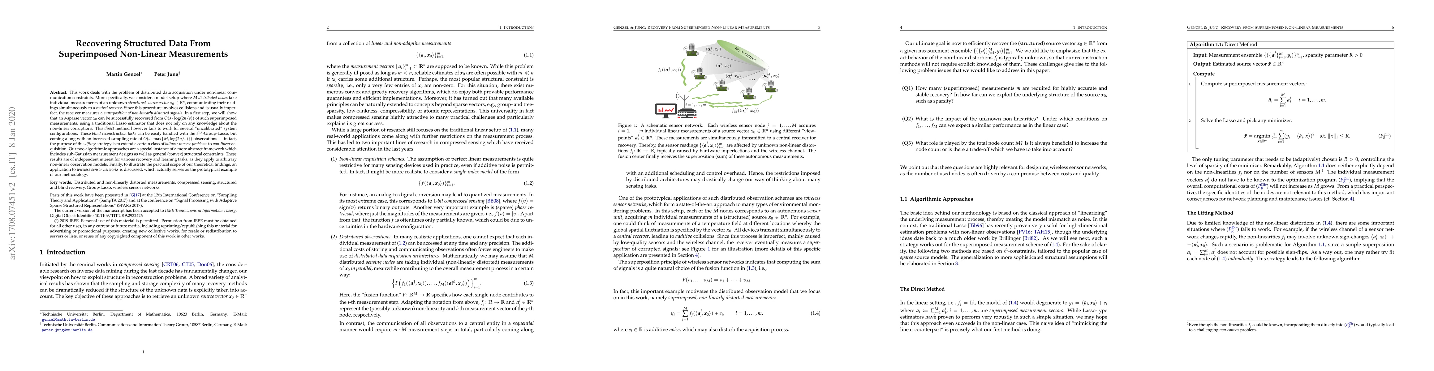This work deals with the problem of distributed data acquisition under non-linear communication constraints. More specifically, we consider a model setup where $M$ distributed nodes take individual measurements of an unknown structured source vector $x_0 \in \mathbb{R}^n$, communicating their readings simultaneously to a central receiver. Since this procedure involves collisions and is usually imperfect, the receiver measures a superposition of non-linearly distorted signals. In a first step, we will show that an $s$-sparse vector $x_0$ can be successfully recovered from $O(s \cdot\log(2n/s))$ of such superimposed measurements, using a traditional Lasso estimator that does not rely on any knowledge about the non-linear corruptions. This direct method however fails to work for several "uncalibrated" system configurations. These blind reconstruction tasks can be easily handled with the $\ell^{1,2}$-Group-Lasso, but coming along with an increased sampling rate of $O(s\cdot \max\{M, \log(2n/s) \})$ observations - in fact, the purpose of this lifting strategy is to extend a certain class of bilinear inverse problems to non-linear acquisition. Our two algorithmic approaches are a special instance of a more abstract framework which includes sub-Gaussian measurement designs as well as general (convex) structural constraints. These results are of independent interest for various recovery and learning tasks, as they apply to arbitrary non-linear observation models. Finally, to illustrate the practical scope of our theoretical findings, an application to wireless sensor networks is discussed, which actually serves as the prototypical example of our methodology.