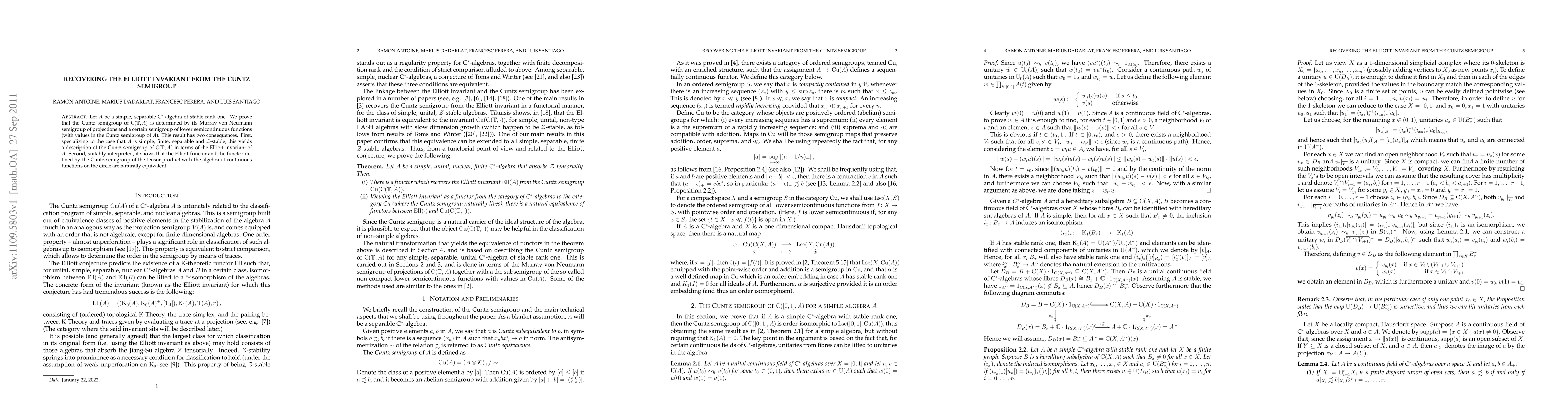 Summary: This paper proves that the Cuntz semigroup of a specific C$^*$-algebra is determined by its projection semigroup and a related lower semicontinuous function semigroup. It demonstrates a connection between the Cuntz semigroup and the Elliott invariant, showing natural equivalence between the Elliott functor and a functor based on the Cuntz semigroup of tensor products with continuous functions on the circle.
