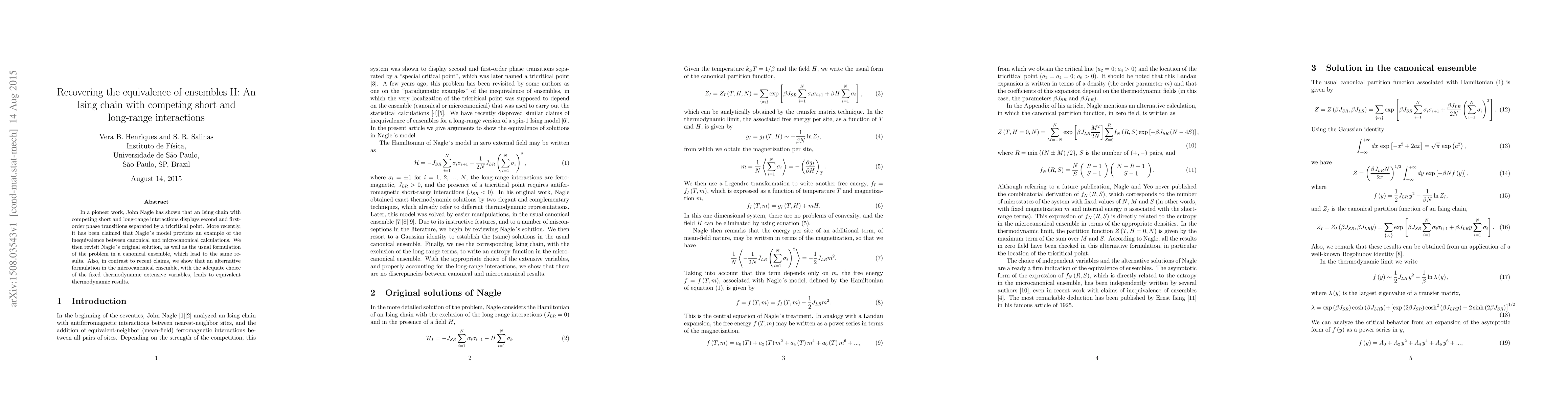 In a pioneer work, John Nagle has shown that an Ising chain with competing short and long-range interactions displays second and first-order phase transitions separated by a tricritical point. More recently, it has been claimed that Nagle's model provides an example of the inequivalence between canonical and microcanonical calculations. We then revisit Nagle's original solution, as well as the usual formulation of the problem in a canonical ensemble, which lead to the same results. Also, in contrast to recent claims, we show that an alternative formulation in the microcanonical ensemble, with the adequate choice of the fixed thermodynamic extensive variables, leads to equivalent thermodynamic results.