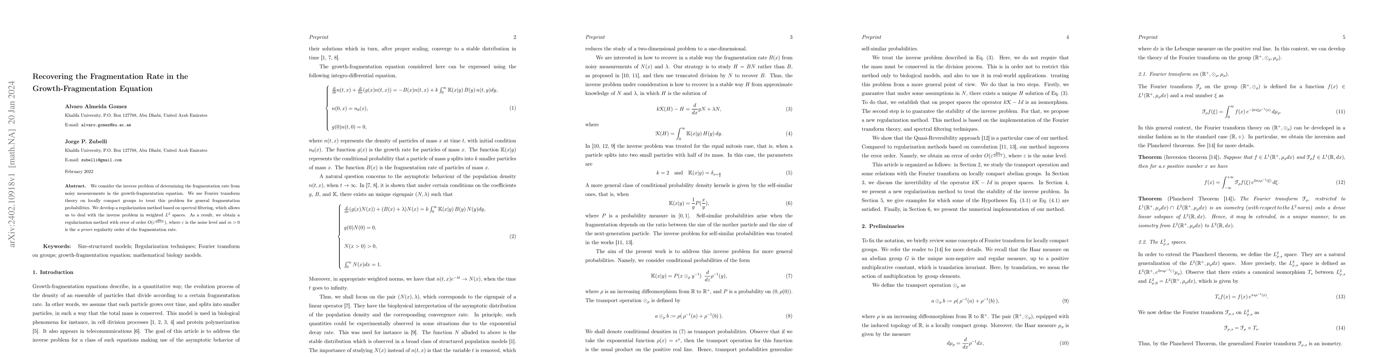 We consider the inverse problem of determining the fragmentation rate from noisy measurements in the growth-fragmentation equation. We use Fourier transform theory on locally compact groups to treat this problem for general fragmentation probabilities. We develop a regularization method based on spectral filtering, which allows us to deal with the inverse problem in weighted ${L}^2$ spaces. %Our approach regularizes the signal generated by differential operators in the frequency domain. As a result, we obtain a regularization method with error of order $O(\varepsilon^{\frac{2m}{2m+1}})$, where $\varepsilon$ is the noise level and $m>0$ is the {\em a priori} regularity order of the fragmentation rate.