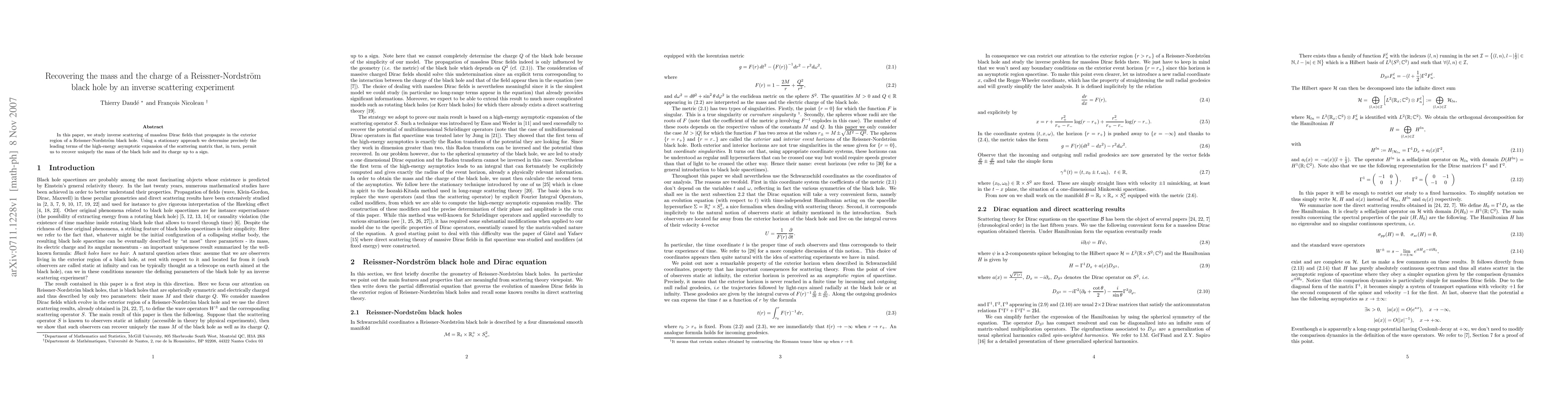 In this paper, we study inverse scattering of massless Dirac fields that propagate in the exterior region of a Reissner-Nordstr\"om black hole. Using a stationary approach we determine precisely the leading terms of the high-energy asymptotic expansion of the scattering matrix that, in turn, permit us to recover uniquely the mass of the black hole and its charge up to a sign.