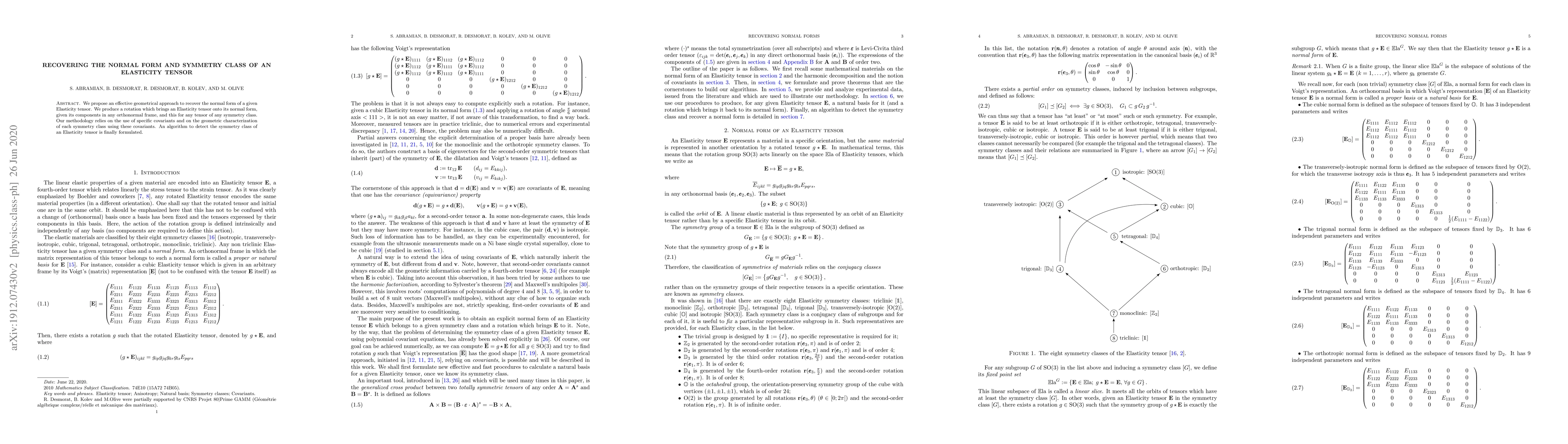 We propose an effective geometrical approach to recover the normal form of a given Elasticity tensor, once we know its symmetry class. In other words, we produce a rotation which brings an Elasticity tensor onto its normal form, given its components in any orthonormal frame, and this for any tensor of any symmetry class. Our methodology relies on the use of specific covariants and on the geometric characterization of each symmetry class using these covariants. An algorithm to detect the symmetry class of an Elasticity tensor is finally formulated.