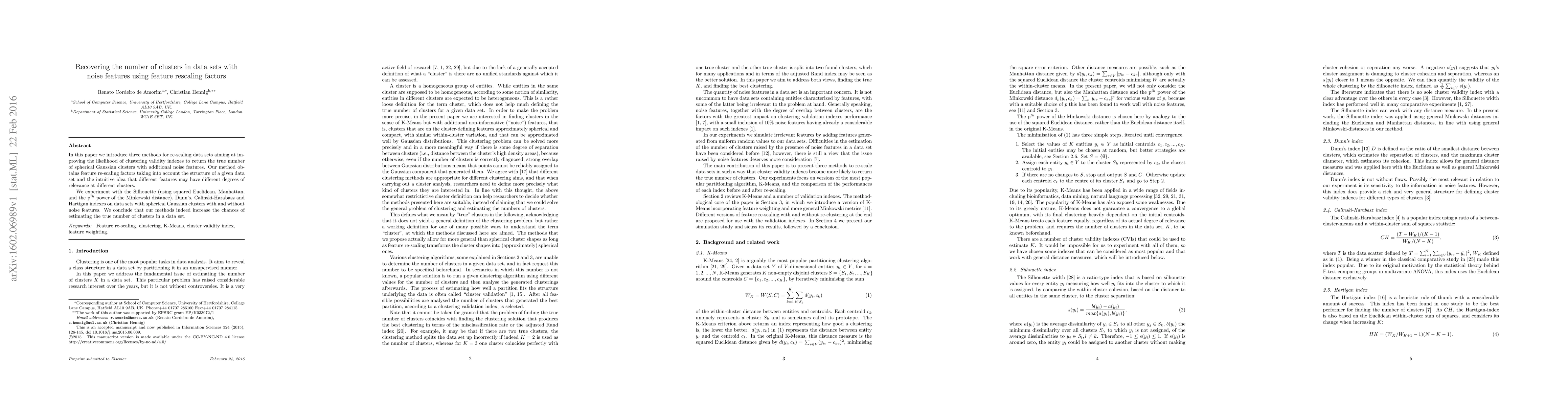 In this paper we introduce three methods for re-scaling data sets aiming at improving the likelihood of clustering validity indexes to return the true number of spherical Gaussian clusters with additional noise features. Our method obtains feature re-scaling factors taking into account the structure of a given data set and the intuitive idea that different features may have different degrees of relevance at different clusters. We experiment with the Silhouette (using squared Euclidean, Manhattan, and the p$^{th}$ power of the Minkowski distance), Dunn's, Calinski-Harabasz and Hartigan indexes on data sets with spherical Gaussian clusters with and without noise features. We conclude that our methods indeed increase the chances of estimating the true number of clusters in a data set.