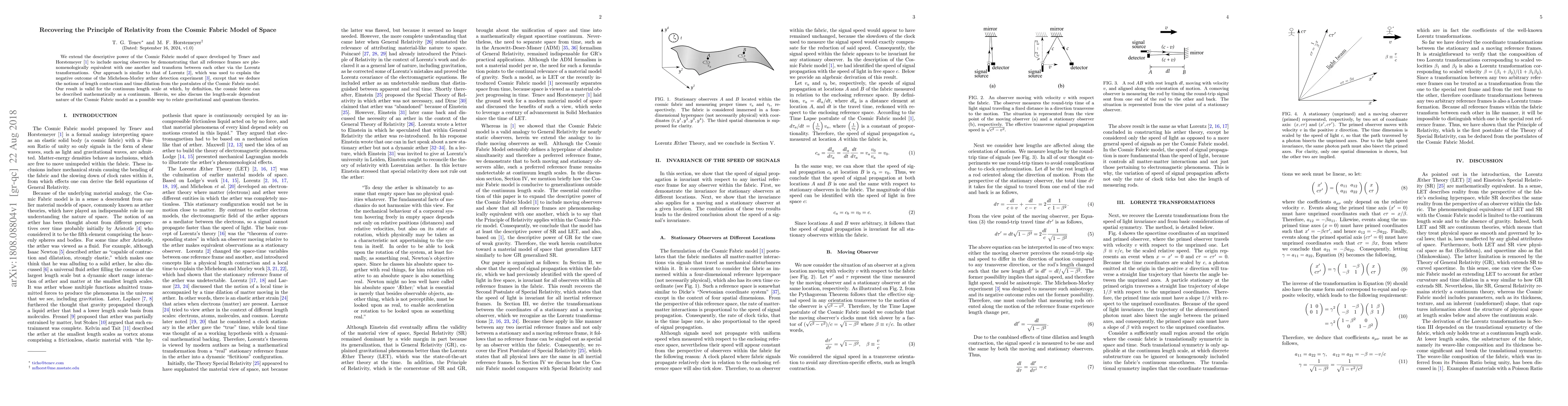 We extend the descriptive power of the Cosmic Fabric model of space developed by Tenev and Horstemeyer (2018) to include moving observers by demonstrating that all reference frames are phenomenologically equivalent with one another and transform between each other via the Lorentz transformations. Our approach is similar to that of Lorentz (1892), which was used to explain the negative outcome of the Michelson-Morley {\ae}ther detection experiment (Michelson and Morley 1887), except that we deduce the notions of length contraction and time dilation from the postulates of the Cosmic Fabric model. Our result is valid for the continuum length scale at which, by definition, the cosmic fabric can be described mathematically as a continuum. Herein, we also discuss the length-scale dependent nature of the Cosmic Fabric model as a possible way to relate gravitational and quantum theories.