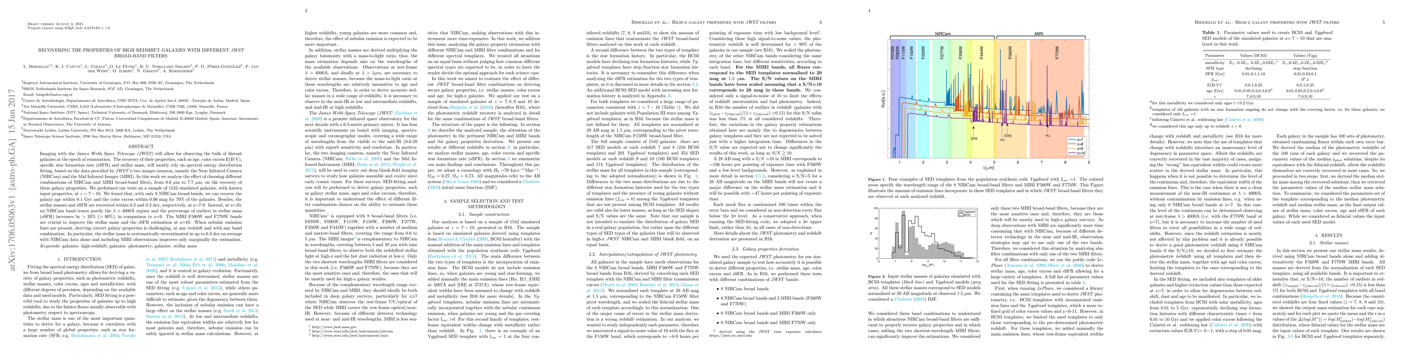This paper investigates the effectiveness of different combinations of JWST's NIRCam and MIRI broad-band filters in recovering properties of high redshift galaxies, such as age, color excess, stellar mass, and sSFR. The study finds that NIRCam alone can recover these properties accurately for galaxies at z=7-9, but struggles at z=10, where MIRI bands are crucial. Nebular emission lines complicate accurate property derivation across all redshifts.