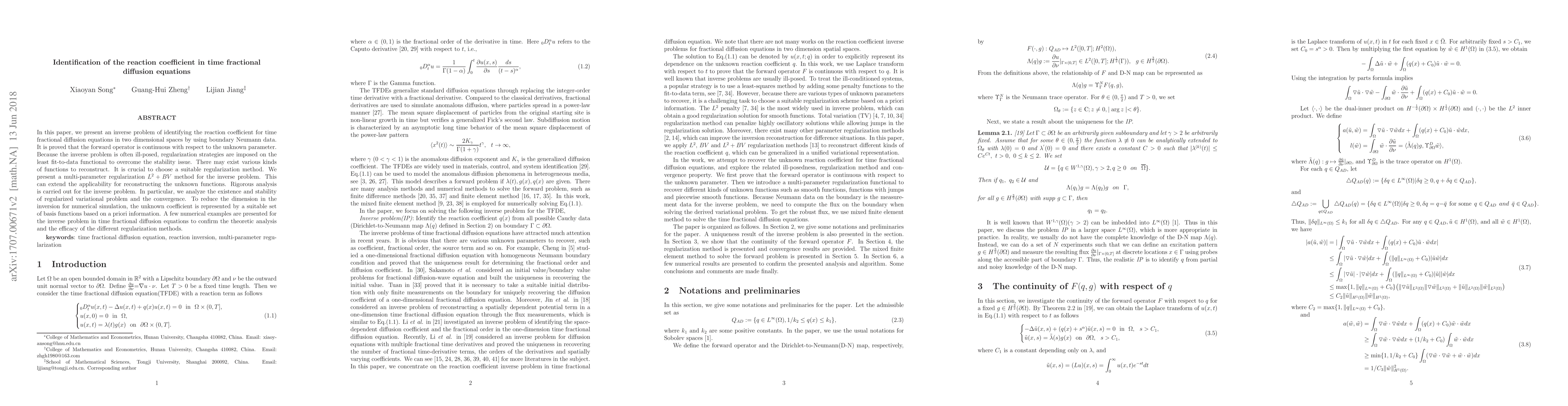 In this paper, we present an inverse problem of identifying the reaction coefficient for time fractional diffusion equations in two dimensional spaces by using boundary Neumann data. It is proved that the forward operator is continuous with respect to the unknown parameter. Because the inverse problem is often ill-posed, regularization strategies are imposed on the least fit-to-data functional to overcome the stability issue. There may exist various kinds of functions to reconstruct. It is crucial to choose a suitable regularization method. We present a multi-parameter regularization $L^{2}+BV$ method for the inverse problem. This can extend the applicability for reconstructing the unknown functions. Rigorous analysis is carried out for the inverse problem. In particular, we analyze the existence and stability of regularized variational problem and the convergence. To reduce the dimension in the inversion for numerical simulation, the unknown coefficient is represented by a suitable set of basis functions based on a priori information. A few numerical examples are presented for the inverse problem in time fractional diffusion equations to confirm the theoretic analysis and the efficacy of the different regularization methods.
