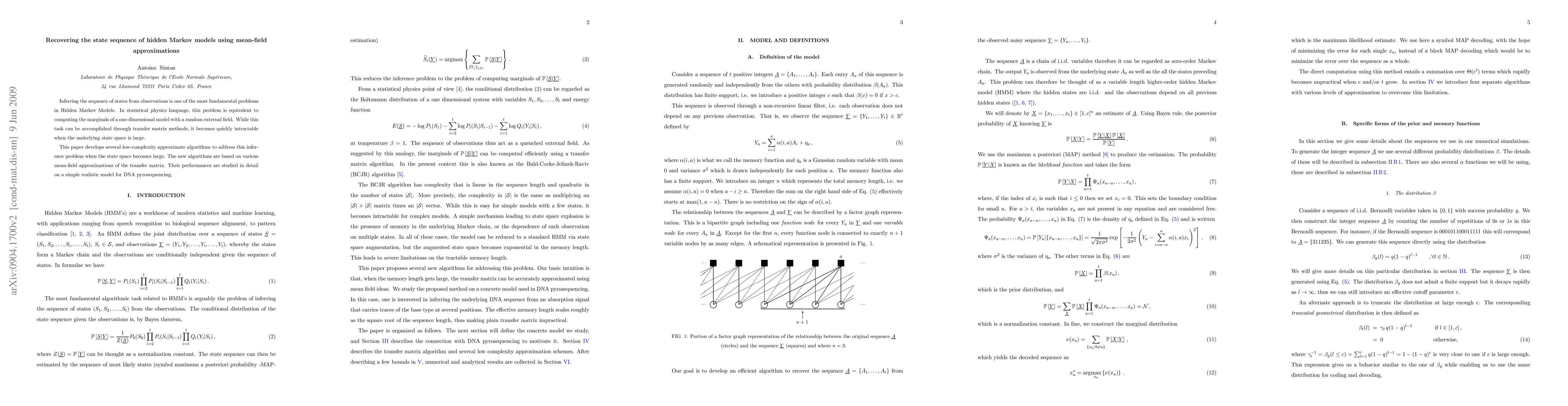 Inferring the sequence of states from observations is one of the most fundamental problems in Hidden Markov Models. In statistical physics language, this problem is equivalent to computing the marginals of a one-dimensional model with a random external field. While this task can be accomplished through transfer matrix methods, it becomes quickly intractable when the underlying state space is large. This paper develops several low-complexity approximate algorithms to address this inference problem when the state space becomes large. The new algorithms are based on various mean-field approximations of the transfer matrix. Their performances are studied in detail on a simple realistic model for DNA pyrosequencing.