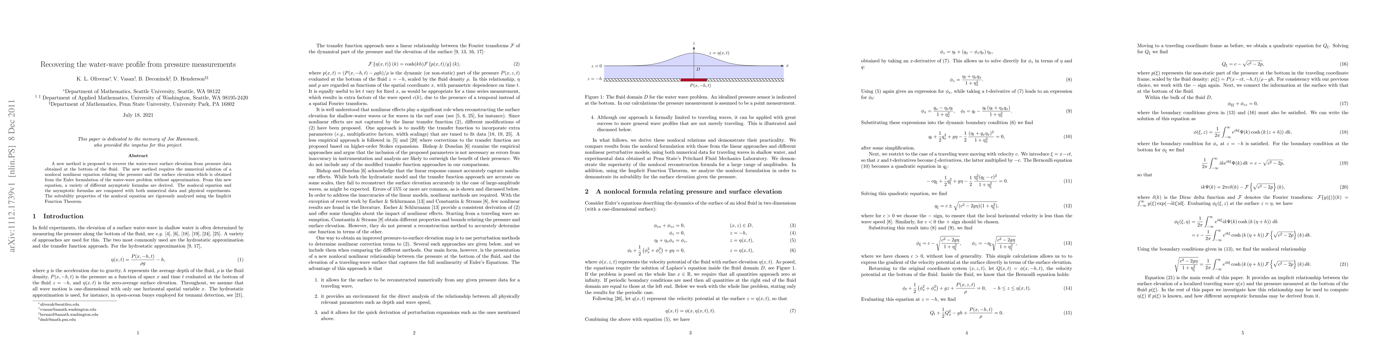 A new method is proposed to recover the water-wave surface elevation from pressure data obtained at the bottom of the fluid. The new method requires the numerical solution of a nonlocal nonlinear equation relating the pressure and the surface elevation which is obtained from the Euler formulation of the water-wave problem without approximation. From this new equation, a variety of different asymptotic formulas are derived. The nonlocal equation and the asymptotic formulas are compared with both numerical data and physical experiments. The solvability properties of the nonlocal equation are rigorously analyzed using the Implicit Function Theorem.