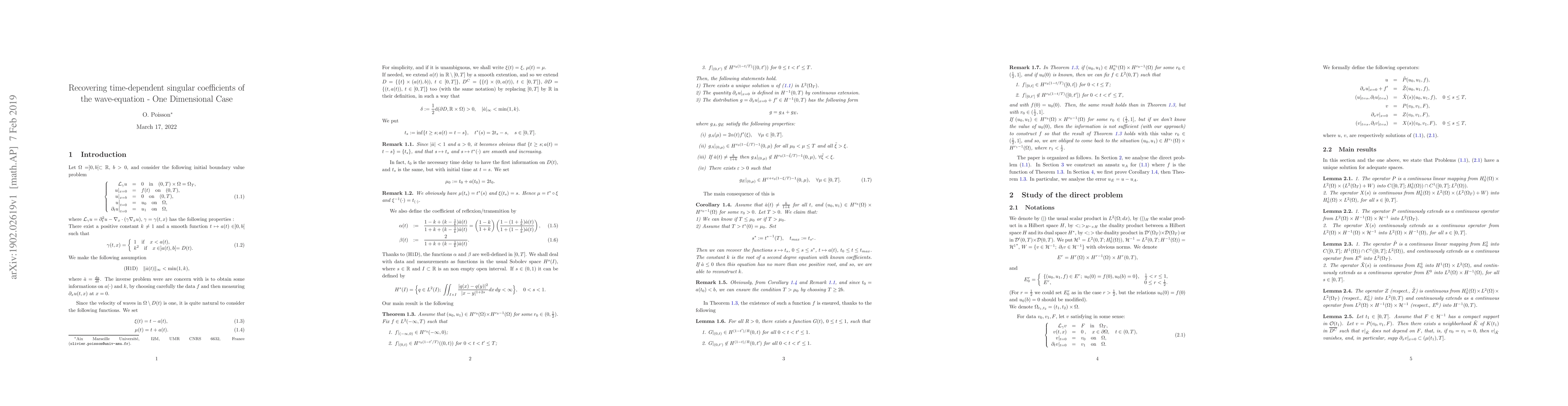 Summary: This paper presents a method for reconstructing time-dependent singular coefficients in the one-dimensional wave equation, addressing challenges associated with the equation's singular nature. The proposed approach aims to enhance the understanding of wave propagation in such scenarios.
