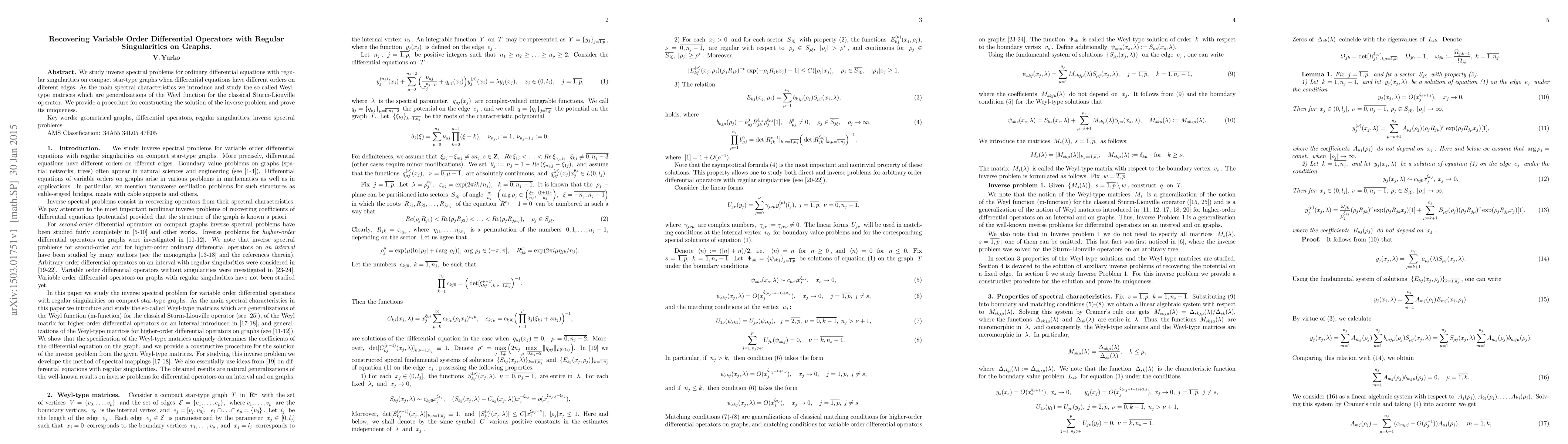 We study inverse spectral problems for ordinary differential equations with regular singularities on compact star-type graphs when differential equations have different orders on diferent edges. As the main spectral characteristics we introduce and study the so-called Weyl-type matrices which are generalizations of the Weyl function for the classical Sturm-Liouville operator. We provide a procedure for constructing the solution of the inverse problem and prove its uniqueness.