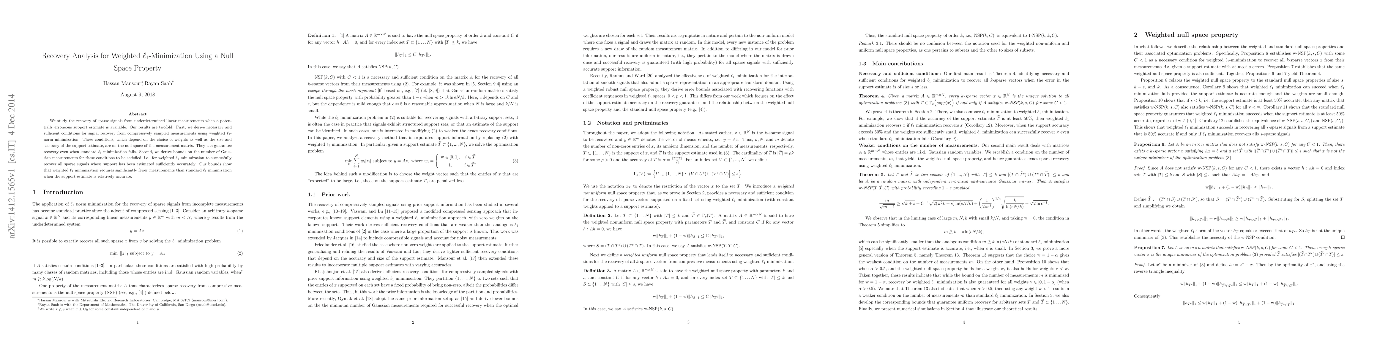 We study the recovery of sparse signals from underdetermined linear measurements when a potentially erroneous support estimate is available. Our results are twofold. First, we derive necessary and sufficient conditions for signal recovery from compressively sampled measurements using weighted $\ell_1$-norm minimization. These conditions, which depend on the choice of weights as well as the size and accuracy of the support estimate, are on the null space of the measurement matrix. They can guarantee recovery even when standard $\ell_1$ minimization fails. Second, we derive bounds on the number of Gaussian measurements for these conditions to be satisfied, i.e., for weighted $\ell_1$ minimization to successfully recover all sparse signals whose support has been estimated sufficiently accurately. Our bounds show that weighted $\ell_1$ minimization requires significantly fewer measurements than standard $\ell_1$ minimization when the support estimate is relatively accurate.