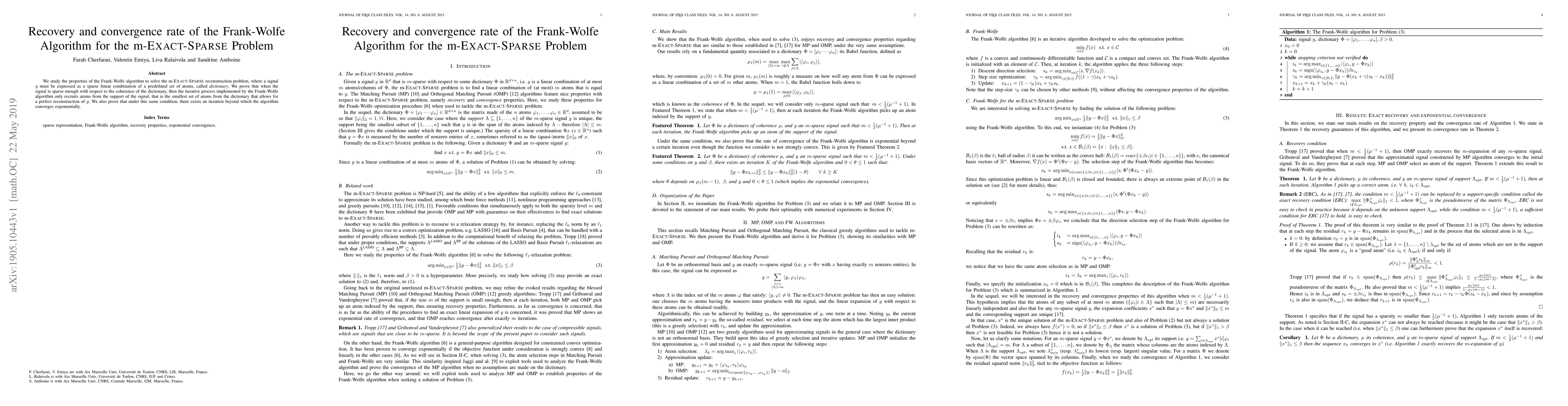 This research proves that the Frank-Wolfe algorithm, when applied to the m-EXACT-SPARSE problem, only uses atoms from the signal's support under certain sparsity conditions relative to dictionary coherence. It also establishes exponential convergence of the algorithm beyond a specific iteration.