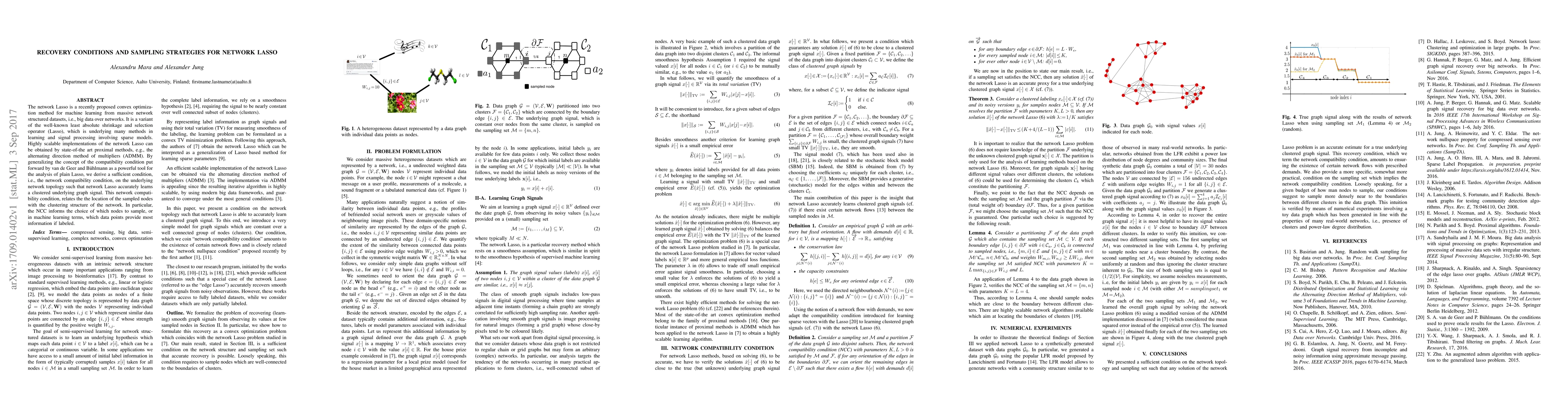 This paper proposes a network Lasso method for learning from massive network datasets and introduces a network compatibility condition (NCC) to ensure accurate learning of clustered graph signals. The NCC provides guidelines for optimal sampling strategies to maximize information gain from labeled data points.