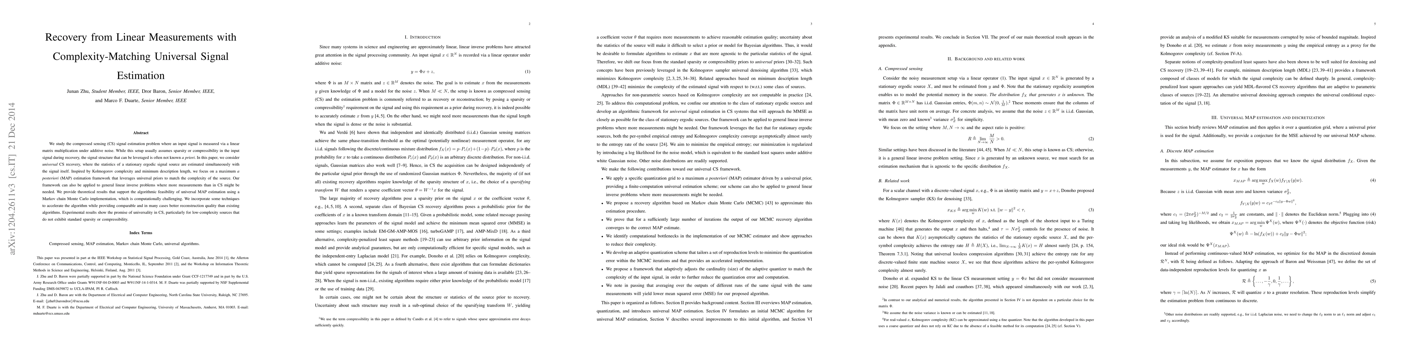 We study the compressed sensing (CS) signal estimation problem where an input signal is measured via a linear matrix multiplication under additive noise. While this setup usually assumes sparsity or compressibility in the input signal during recovery, the signal structure that can be leveraged is often not known a priori. In this paper, we consider universal CS recovery, where the statistics of a stationary ergodic signal source are estimated simultaneously with the signal itself. Inspired by Kolmogorov complexity and minimum description length, we focus on a maximum a posteriori (MAP) estimation framework that leverages universal priors to match the complexity of the source. Our framework can also be applied to general linear inverse problems where more measurements than in CS might be needed. We provide theoretical results that support the algorithmic feasibility of universal MAP estimation using a Markov chain Monte Carlo implementation, which is computationally challenging. We incorporate some techniques to accelerate the algorithm while providing comparable and in many cases better reconstruction quality than existing algorithms. Experimental results show the promise of universality in CS, particularly for low-complexity sources that do not exhibit standard sparsity or compressibility.