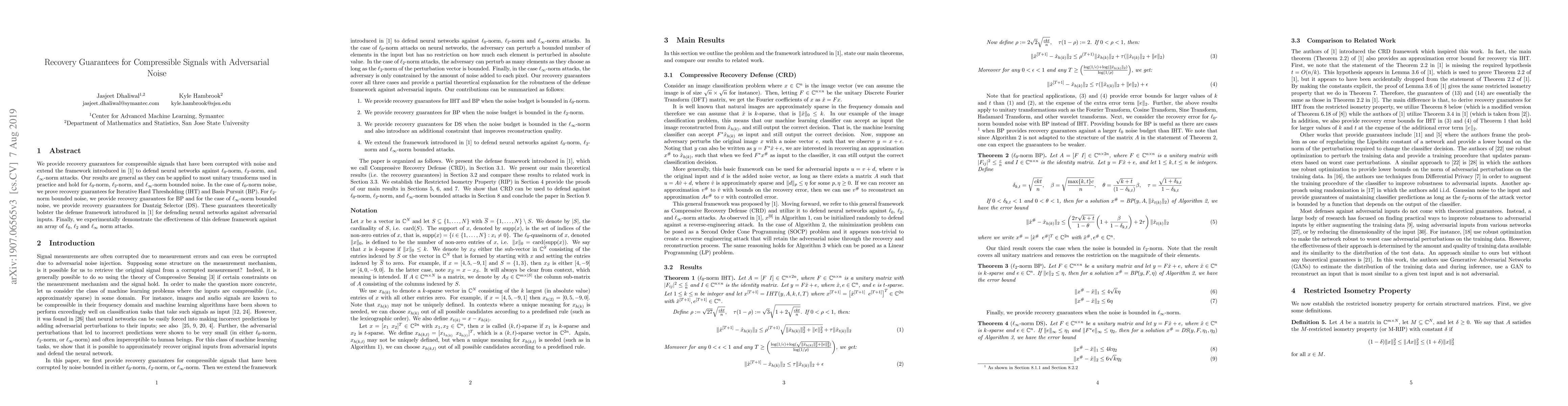 This paper extends a framework to defend neural networks against adversarial noise, providing recovery guarantees for compressible signals corrupted by $\ell_0$, $\ell_2$, and $\ell_\infty$ norm attacks. It applies to various unitary transforms and supports Iterative Hard Thresholding, Basis Pursuit, and Dantzig Selector methods.