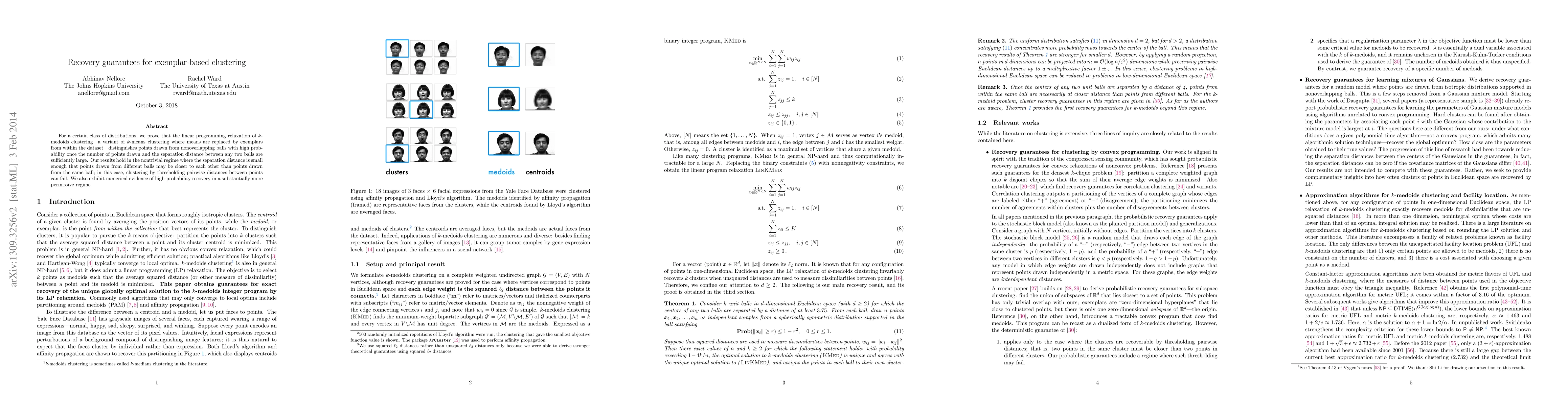 For a certain class of distributions, we prove that the linear programming relaxation of $k$-medoids clustering---a variant of $k$-means clustering where means are replaced by exemplars from within the dataset---distinguishes points drawn from nonoverlapping balls with high probability once the number of points drawn and the separation distance between any two balls are sufficiently large. Our results hold in the nontrivial regime where the separation distance is small enough that points drawn from different balls may be closer to each other than points drawn from the same ball; in this case, clustering by thresholding pairwise distances between points can fail. We also exhibit numerical evidence of high-probability recovery in a substantially more permissive regime.