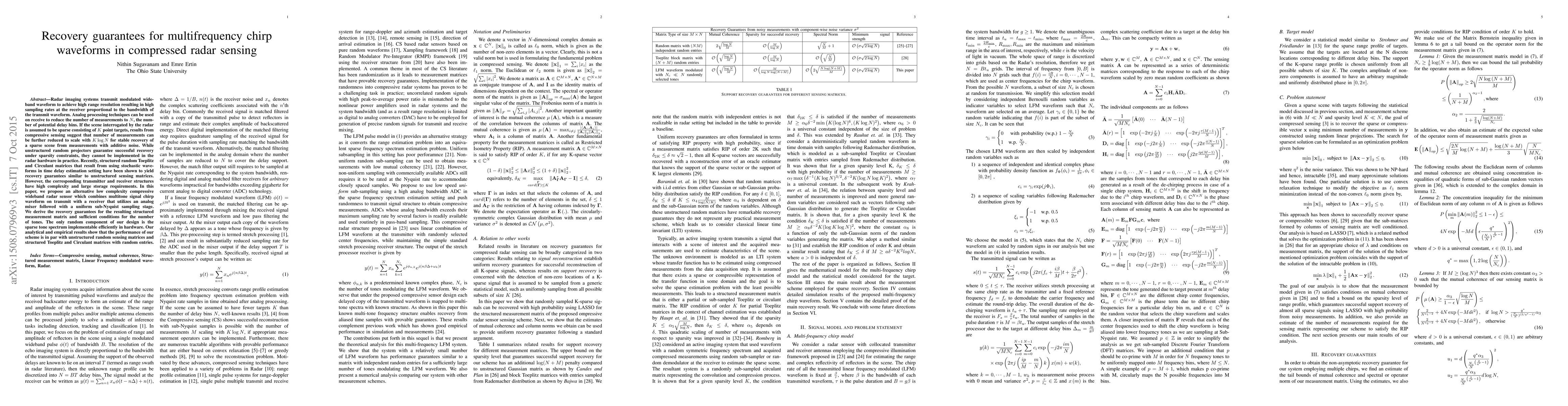 This paper proposes a low complexity compressive radar sensing system using multifrequency chirp waveforms, combining analog mixers and sub-Nyquist sampling. It derives recovery guarantees for the structured measurement matrix, showing performance comparable to unstructured random matrices and structured Toeplitz/Circulant matrices, with minimal hardware complexity.