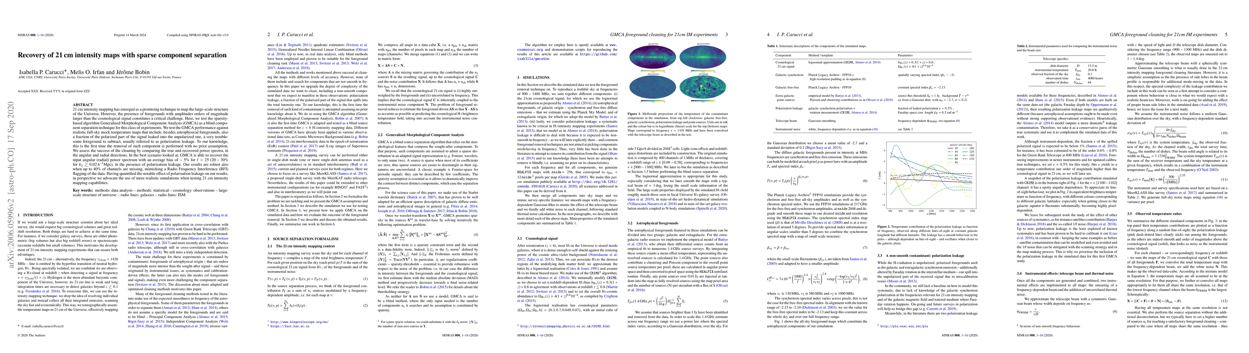 21 cm intensity mapping has emerged as a promising technique to map the large-scale structure of the Universe. However, the presence of foregrounds with amplitudes orders of magnitude larger than the cosmological signal constitutes a critical challenge. Here, we test the sparsity-based algorithm Generalised Morphological Component Analysis (GMCA) as a blind component separation technique for this class of experiments. We test the GMCA performance against realistic full-sky mock temperature maps that include, besides astrophysical foregrounds, also a fraction of the polarized part of the signal leaked into the unpolarized one, a very troublesome foreground to subtract, usually referred to as polarization leakage. To our knowledge, this is the first time the removal of such component is performed with no prior assumption. We assess the success of the cleaning by comparing the true and recovered power spectra, in the angular and radial directions. In the best scenario looked at, GMCA is able to recover the input angular (radial) power spectrum with an average bias of $\sim 5\%$ for $\ell>25$ ($20 - 30 \%$ for $k_{\parallel} \gtrsim 0.02 \,h^{-1}$Mpc), in the presence of polarization leakage. Our results are robust also when up to $40\%$ of channels are missing, mimicking a Radio Frequency Interference (RFI) flagging of the data. Having quantified the notable effect of polarisation leakage on our results, in perspective we advocate the use of more realistic simulations when testing 21 cm intensity mapping capabilities.