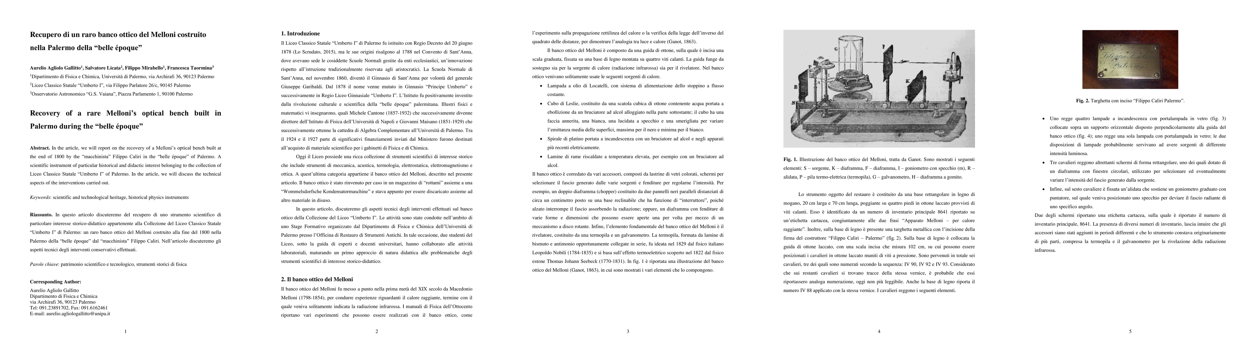 In the article, we will report on the recovery of a Melloni's optical bench built at the end of 1800 by the "macchinista" Filippo Caliri in the "belle \'epoque" of Palermo. A scientific instrument of particular historical and didactic interest belonging to the collection of Liceo Classico Statale "Umberto I" of Palermo. In the article, we will discuss the technical aspects of the interventions carried out. In questo articolo discuteremo del recupero di uno strumento scientifico di particolare interesse storico-didattico appartenente alla Collezione del Liceo Classico Statale "Umberto I" di Palermo: un raro banco ottico del Melloni costruito alla fine del 1800 nella Palermo della "belle \'epoque" dal "macchinista" Filippo Caliri. Nell'articolo discuteremo gli aspetti tecnici degli interventi conservativi effettuati.