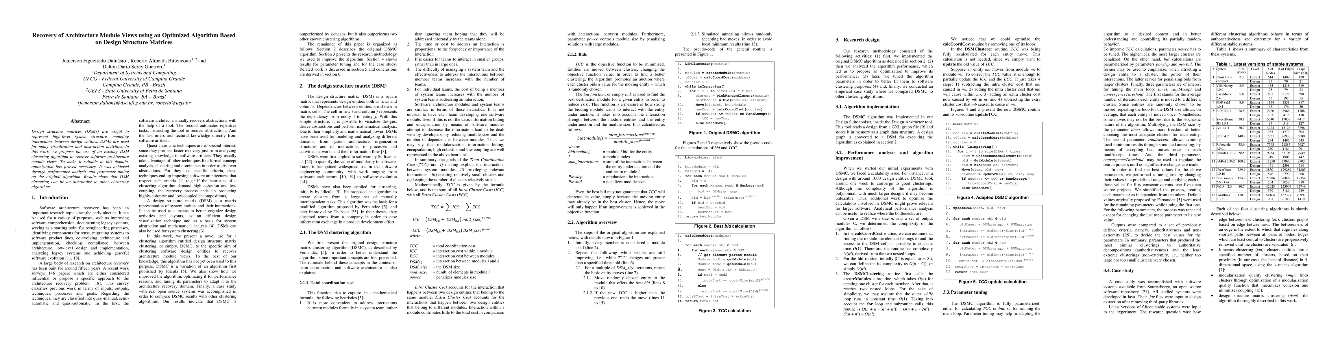 Design structure matrices (DSMs) are useful to represent high-level system structure, modeling interactions between design entities. DSMs are used for many visualization and abstraction activities. In this work, we propose the use of an existing DSM clustering algorithm to recover software architecture module views. To make it suitable to this domain, optimization has proved necessary. It was achieved through performance analysis and parameter tuning on the original algorithm. Results show that DSM clustering can be an alternative to other clustering algorithms.
