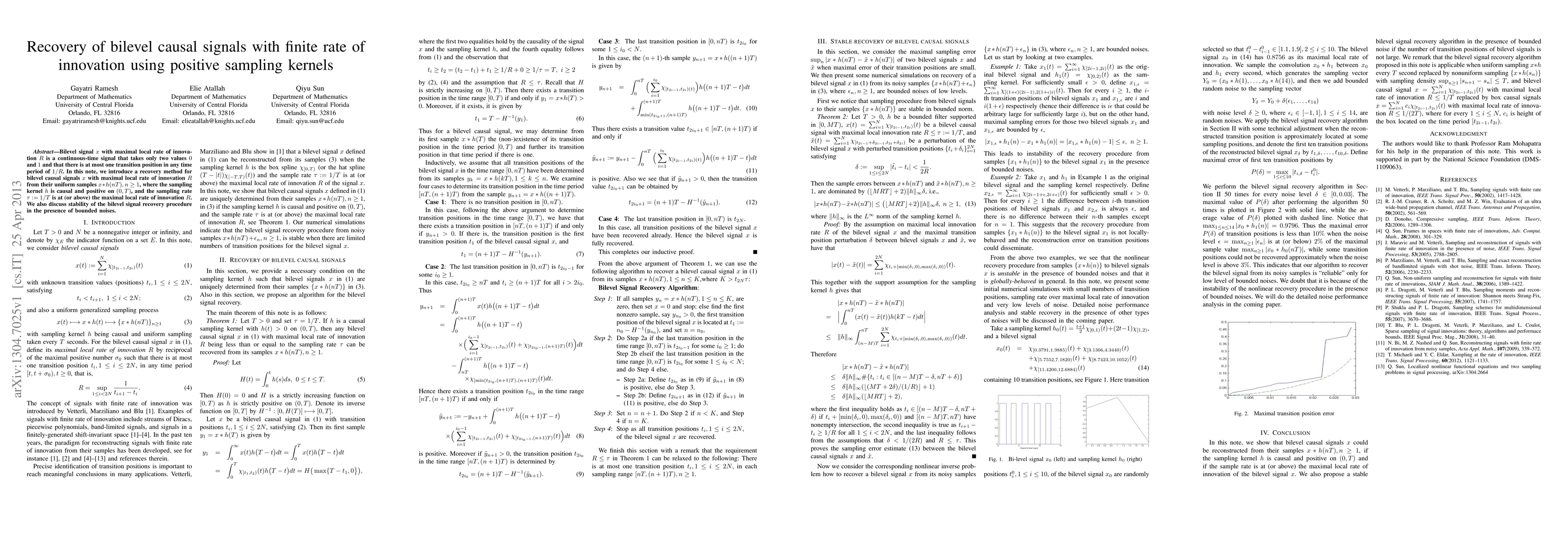 Bilevel signal $x$ with maximal local rate of innovation $R$ is a continuous-time signal that takes only two values 0 and 1 and that there is at most one transition position in any time period of 1/R.In this note, we introduce a recovery method for bilevel causal signals $x$ with maximal local rate of innovation $R$ from their uniform samples $x*h(nT), n\ge 1$, where the sampling kernel $h$ is causal and positive on $(0, T)$, and the sampling rate $\tau:=1/T$ is at (or above) the maximal local rate of innovation $R$. We also discuss stability of the bilevel signal recovery procedure in the presence of bounded noises.