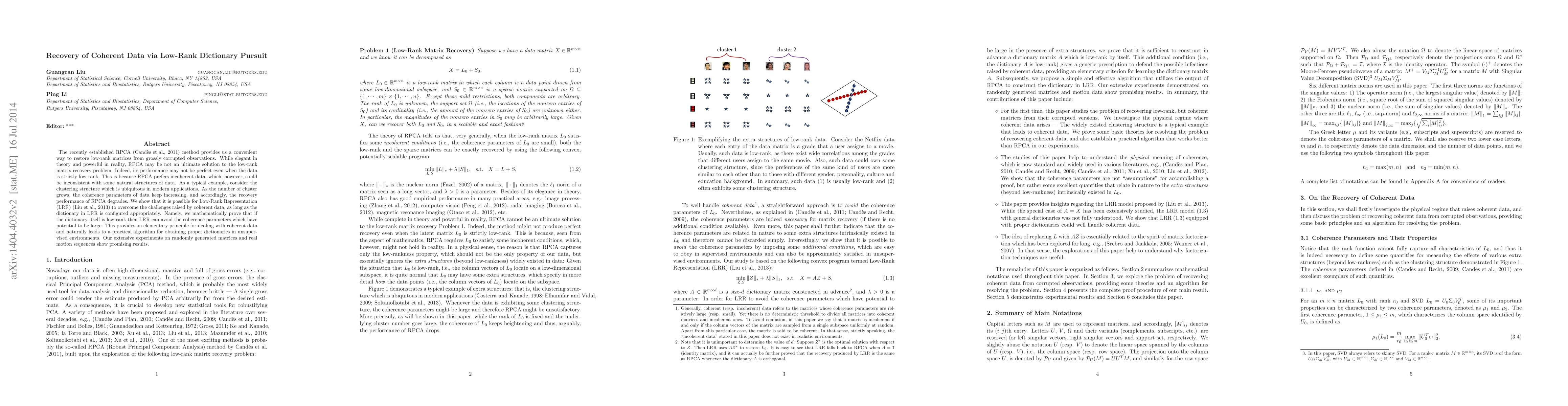 The recently established RPCA method provides us a convenient way to restore low-rank matrices from grossly corrupted observations. While elegant in theory and powerful in reality, RPCA may be not an ultimate solution to the low-rank matrix recovery problem. Indeed, its performance may not be perfect even when data are strictly low-rank. This is because conventional RPCA ignores the clustering structures of the data which are ubiquitous in modern applications. As the number of cluster grows, the coherence of data keeps increasing, and accordingly, the recovery performance of RPCA degrades. We show that the challenges raised by coherent data (i.e., the data with high coherence) could be alleviated by Low-Rank Representation (LRR), provided that the dictionary in LRR is configured appropriately. More precisely, we mathematically prove that if the dictionary itself is low-rank then LRR is immune to the coherence parameter which increases with the underlying cluster number. This provides an elementary principle for dealing with coherent data. Subsequently, we devise a practical algorithm to obtain proper dictionaries in unsupervised environments. Our extensive experiments on randomly generated matrices verify our claims.