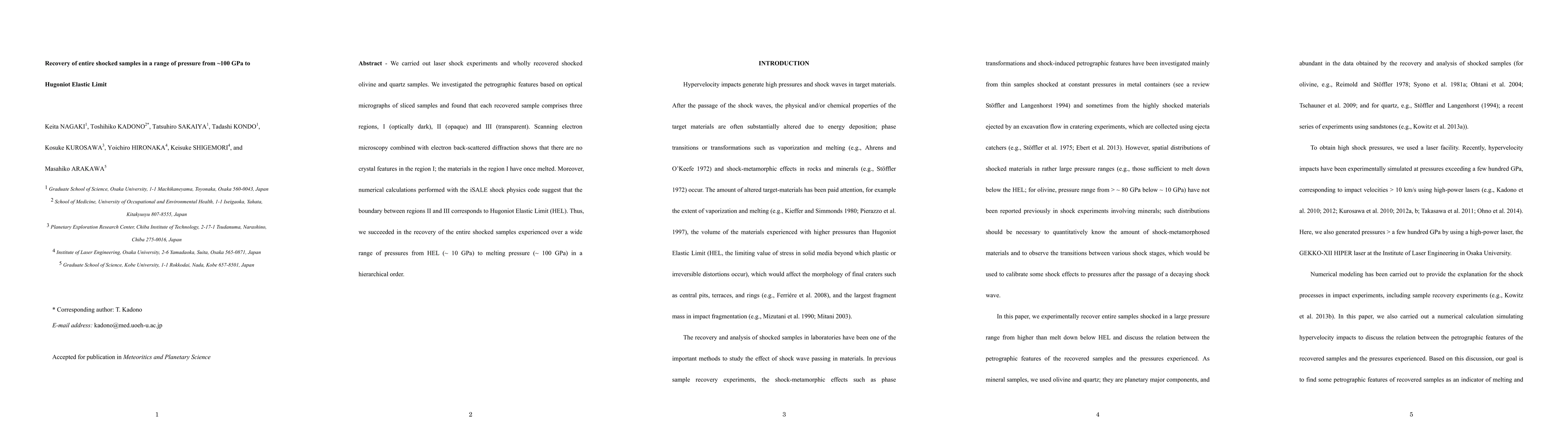 We carried out laser shock experiments and wholly recovered shocked olivine and quartz samples. We investigated the petrographic features based on optical micrographs of sliced samples and found that each recovered sample comprises three regions, I (optically dark), II (opaque) and III (transparent). Scanning electron microscopy combined with electron back-scattered diffraction shows that there are no crystal features in the region I; the materials in the region I have once melted. Moreover, numerical calculations performed with the iSALE shock physics code suggest that the boundary between regions II and III corresponds to Hugoniot Elastic Limit (HEL). Thus, we succeeded in the recovery of the entire shocked samples experienced over a wide range of pressures from HEL (~ 10 GPa) to melting pressure (~ 100 GPa) in a hierarchical order.