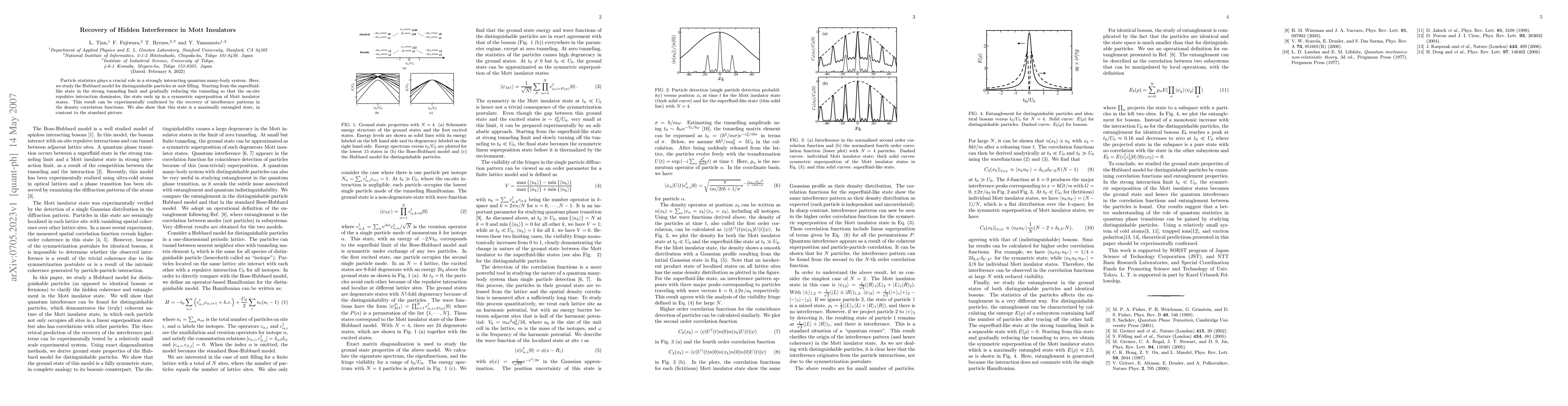 Particle statistics plays a crucial role in a strongly interacting quantum many-body system. Here, we study the Hubbard model for distinguishable particles at unit filling. Starting from the superfluid-like state in the strong tunneling limit and gradually reducing the tunneling so that the on-site repulsive interaction dominates, the state ends up in a symmetric superposition of Mott insulator states. This result can be experimentally confirmed by the recovery of interference patterns in the density correlation functions. We also show that this state is a maximally entangled state, in contrast to the standard picture.