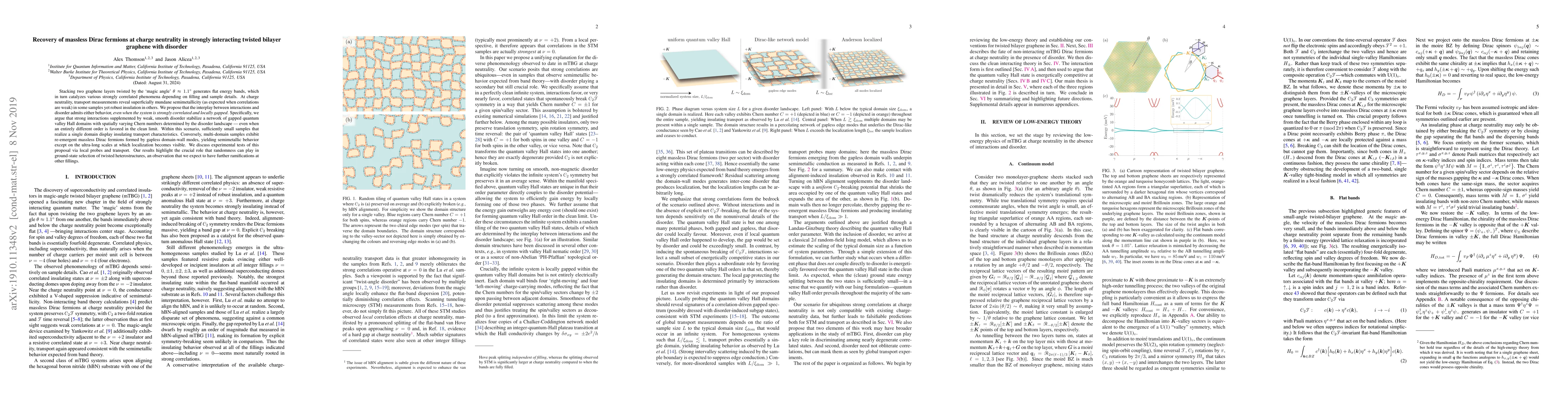 Stacking two graphene layers twisted by the 'magic angle' $\theta \approx 1.1^\circ$ generates flat energy bands, which in turn catalyzes various strongly correlated phenomena depending on filling and sample details. At charge neutrality, transport measurements reveal superficially mundane semimetallicity (as expected when correlations are weak) in some samples yet robust insulation in others. We propose that the interplay between interactions and disorder admits either behavior, even when the system is strongly correlated and locally gapped. Specifically, we argue that strong interactions supplemented by weak, smooth disorder stabilize a network of gapped quantum valley Hall domains with spatially varying Chern numbers determined by the disorder landscape--even when an entirely different order is favored in the clean limit. Within this scenario, sufficiently small samples that realize a single domain display insulating transport characteristics. Conversely, multi-domain samples exhibit re-emergent massless Dirac fermions formed by gapless domain-wall modes, yielding semimetallic behavior except on the ultra-long scales at which localization becomes visible. We discuss experimental tests of this proposal via local probes and transport. Our results highlight the crucial role that randomness can play in ground-state selection of twisted heterostructures, an observation that we expect to have further ramifications at other fillings.