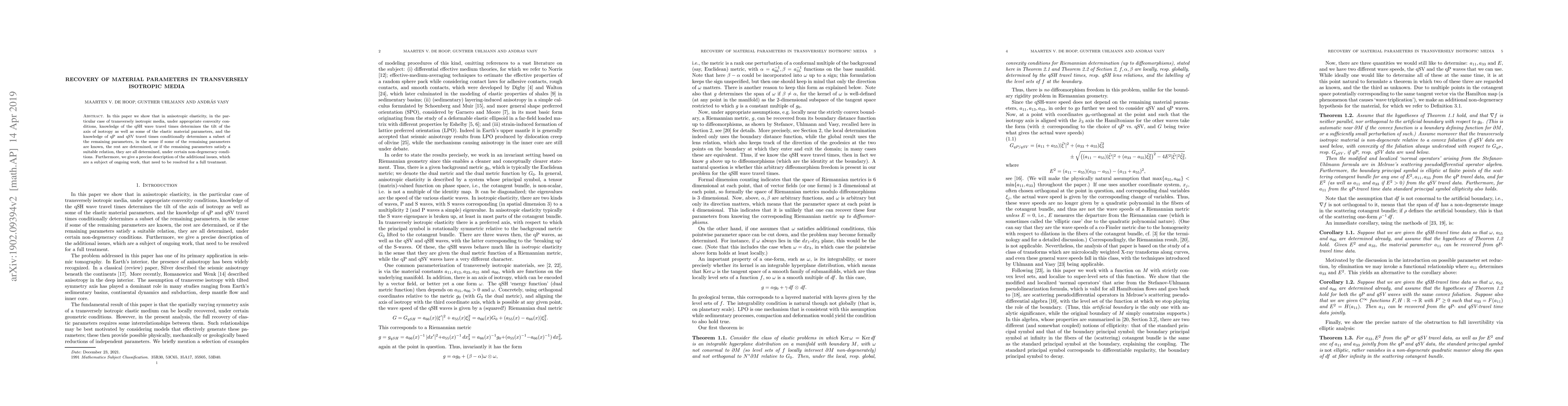 This paper demonstrates that in transversely isotropic media, knowledge of qSH wave travel times can determine the axis of isotropy and some elastic parameters, while qP and qSV travel times can conditionally determine the remaining parameters, provided additional conditions are met. Ongoing work aims to resolve additional issues for a complete treatment.